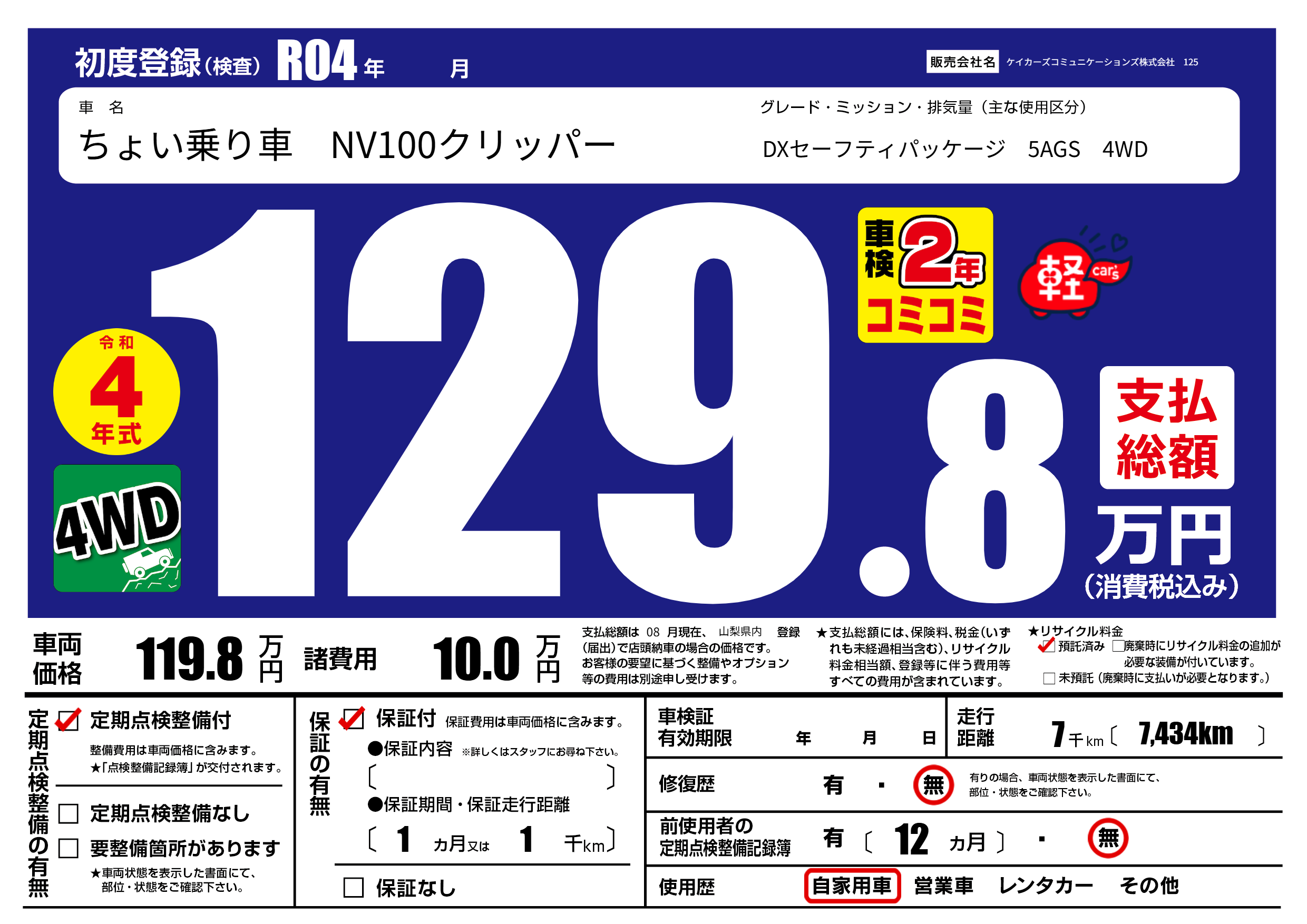 | 車名 | ちょい乗り車 NV100クリッパー | グレード ミッション 排気量 |
