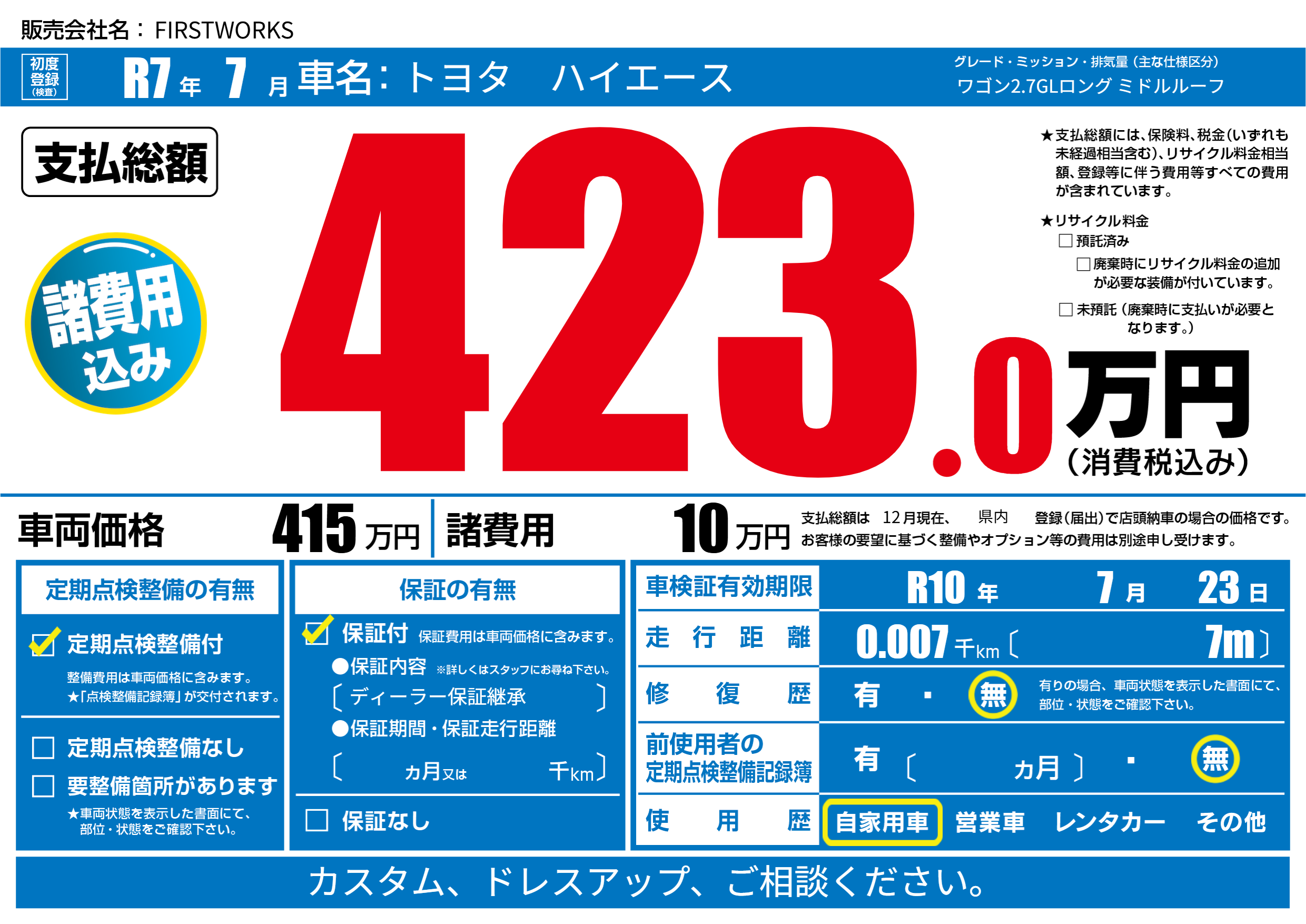 | 走行キロ | - | 初年度登録 | R7年7月 |