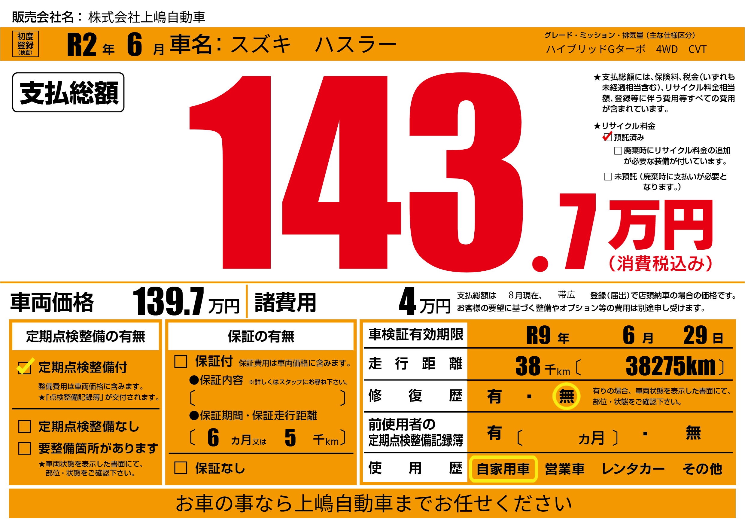 | 車名 | スズキ ハスラー | グレード ミッション 排気量 |