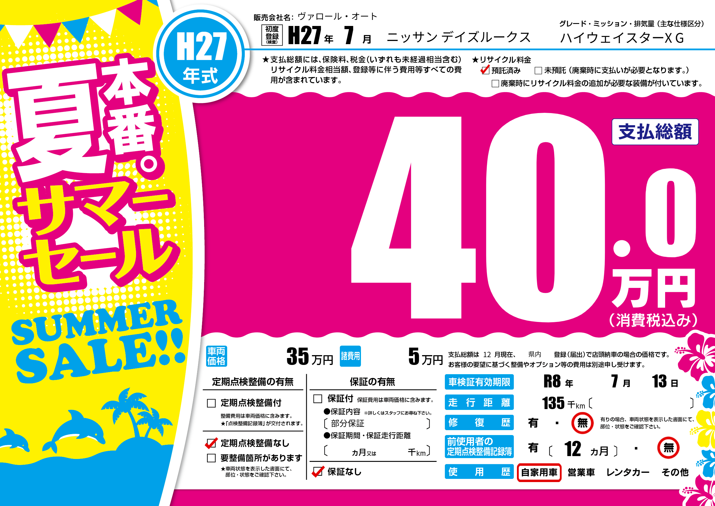 | 走行キロ | 13.5万km | 初年度登録 | H27年7月 |