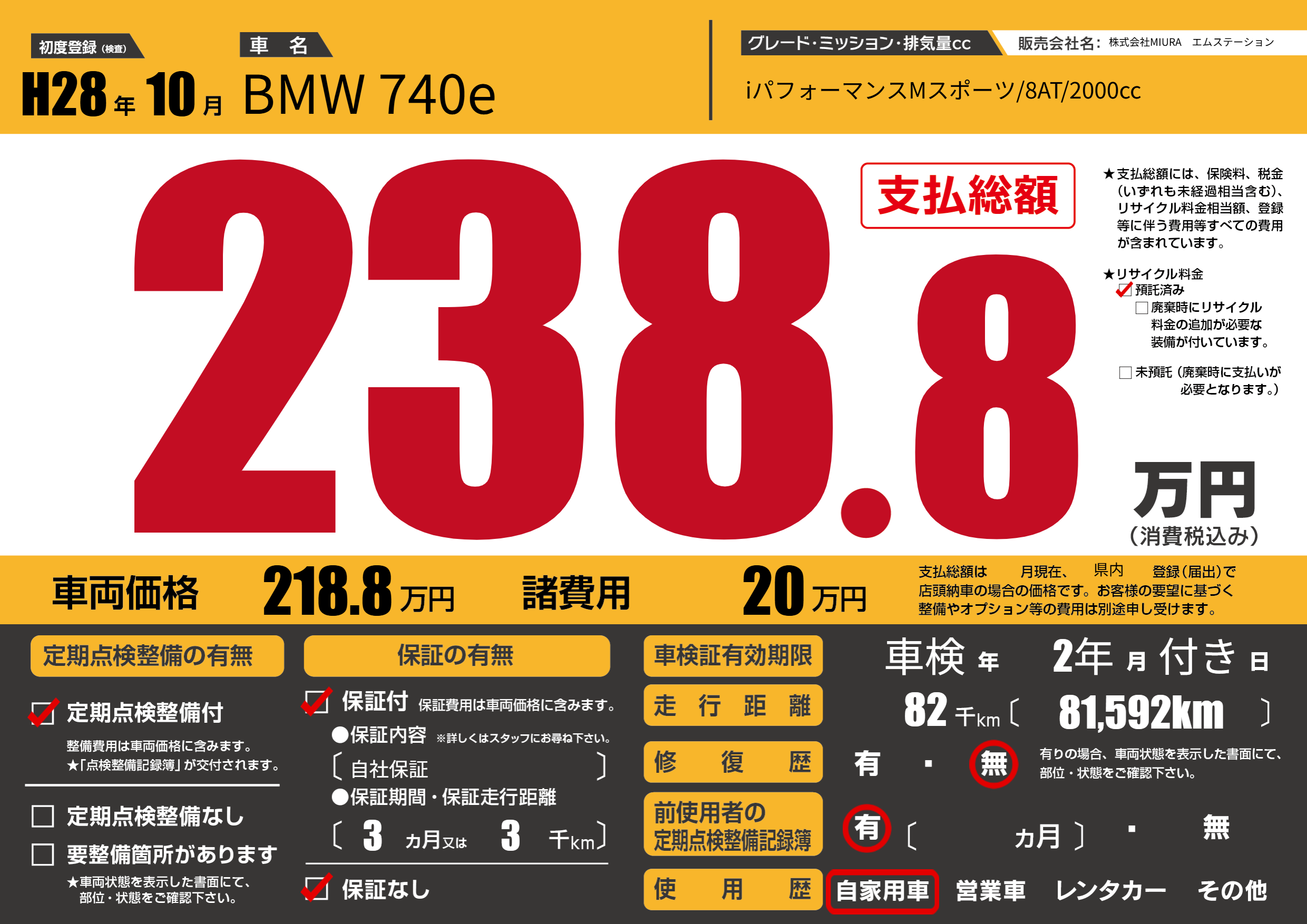 | 車名 | BMW 740e | グレード ミッション 排気量 |