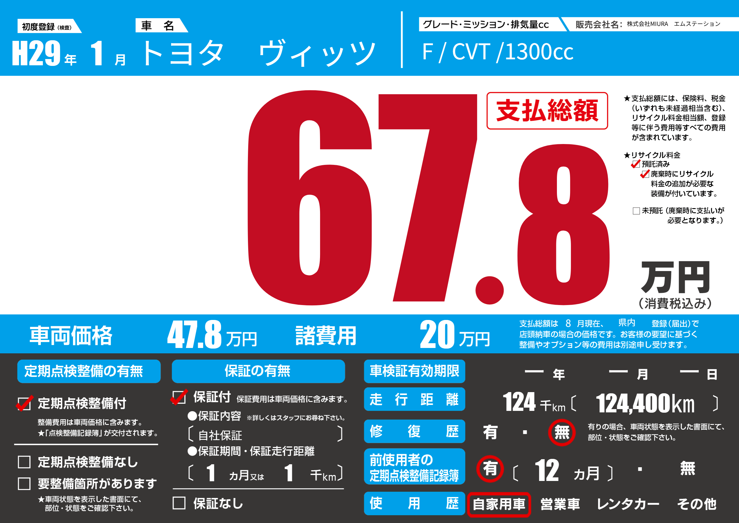 | 車名 | トヨタ ヴィッツ | グレード ミッション 排気量 |