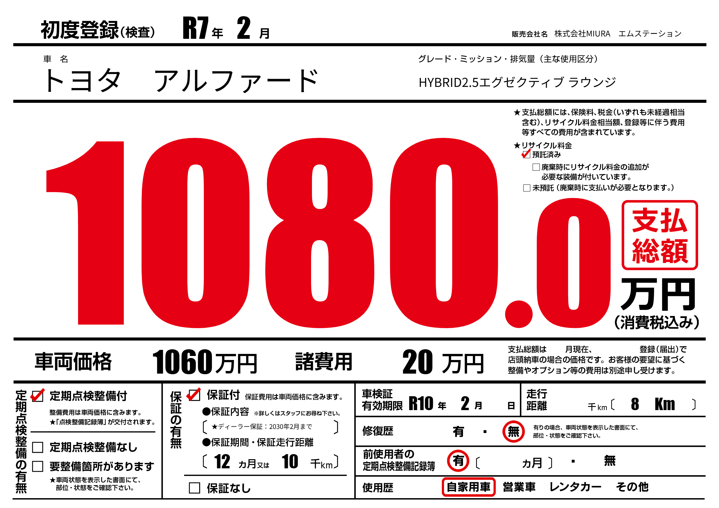 保証付き 保証内容(★ディーラー保証:2030年2月まで) 12ヶ月または10千km |