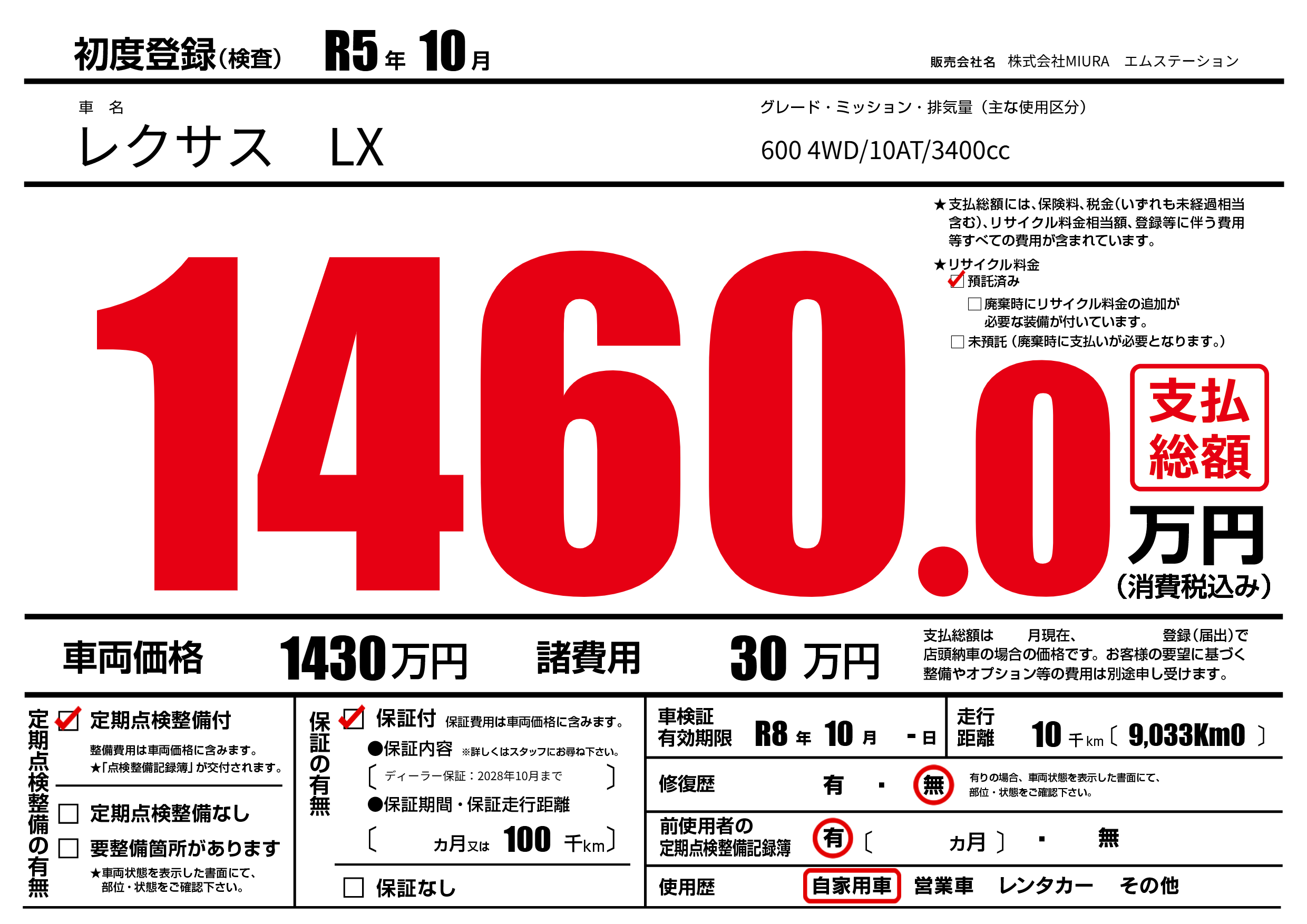 | 車名 | レクサス LX | グレード ミッション 排気量 |