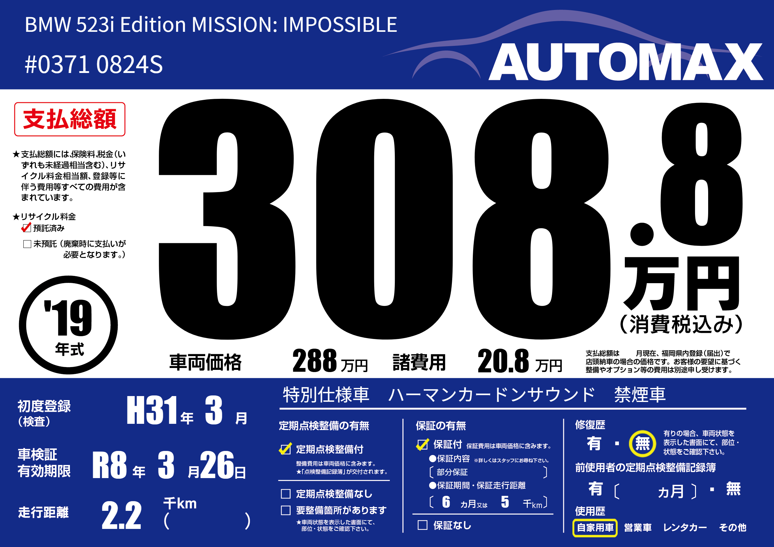 | 車名 | BMW 523i Edition MISSION: IMPOSSIBLE | グレード ミッション 排気量 |