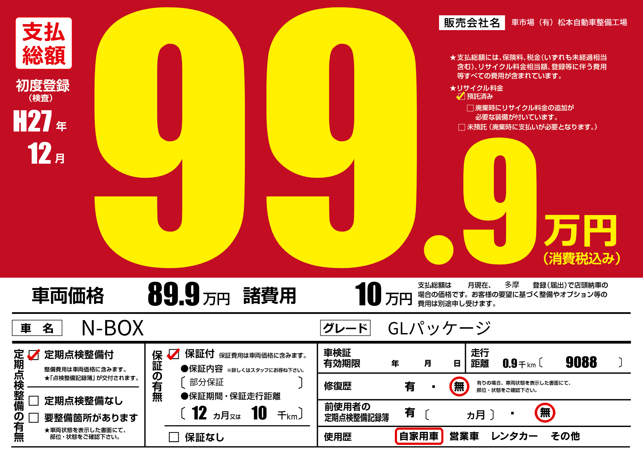 | 車名 | N-BOX | グレード ミッション 排気量 |