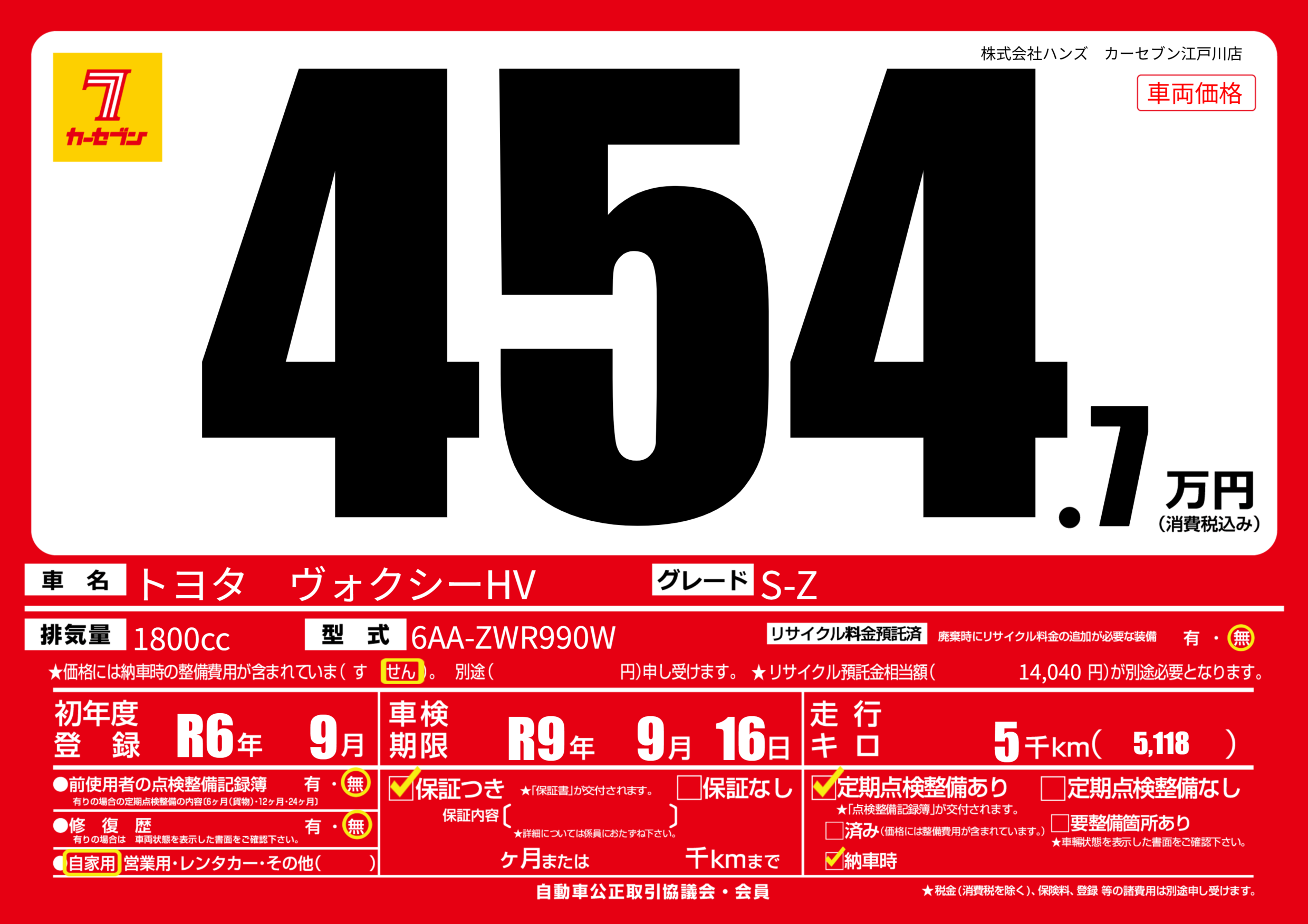 なし | 車検制限 | R9年9月16月 |