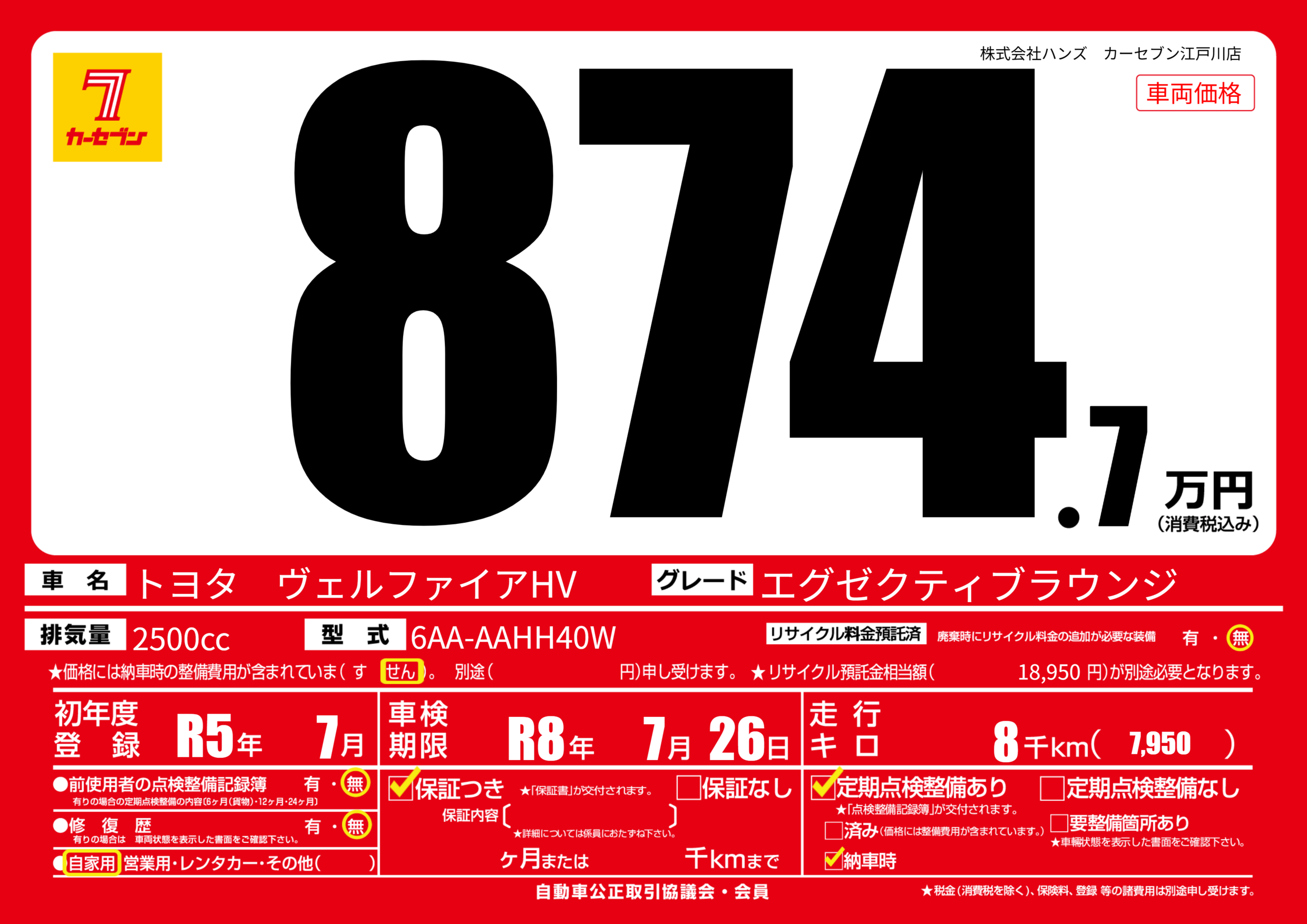 | 走行キロ | 0.8万km | 初年度登録 | R5年7月 |