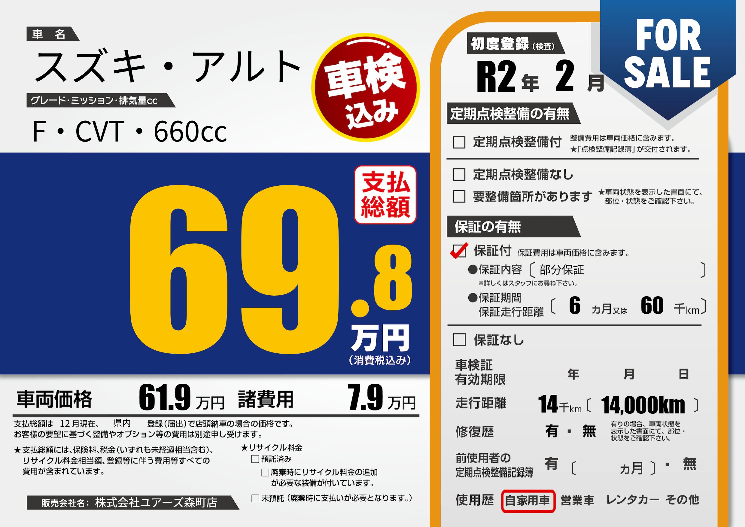 保証付き 保証内容(部分保証) 6ヶ月または(60)千kmまで |