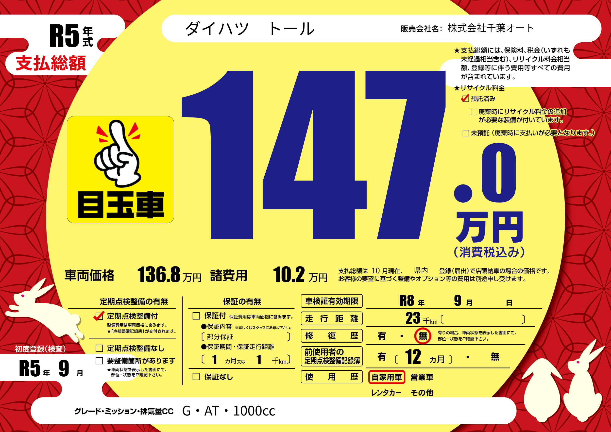 なし | 車検制限 | R8年9月---月 |