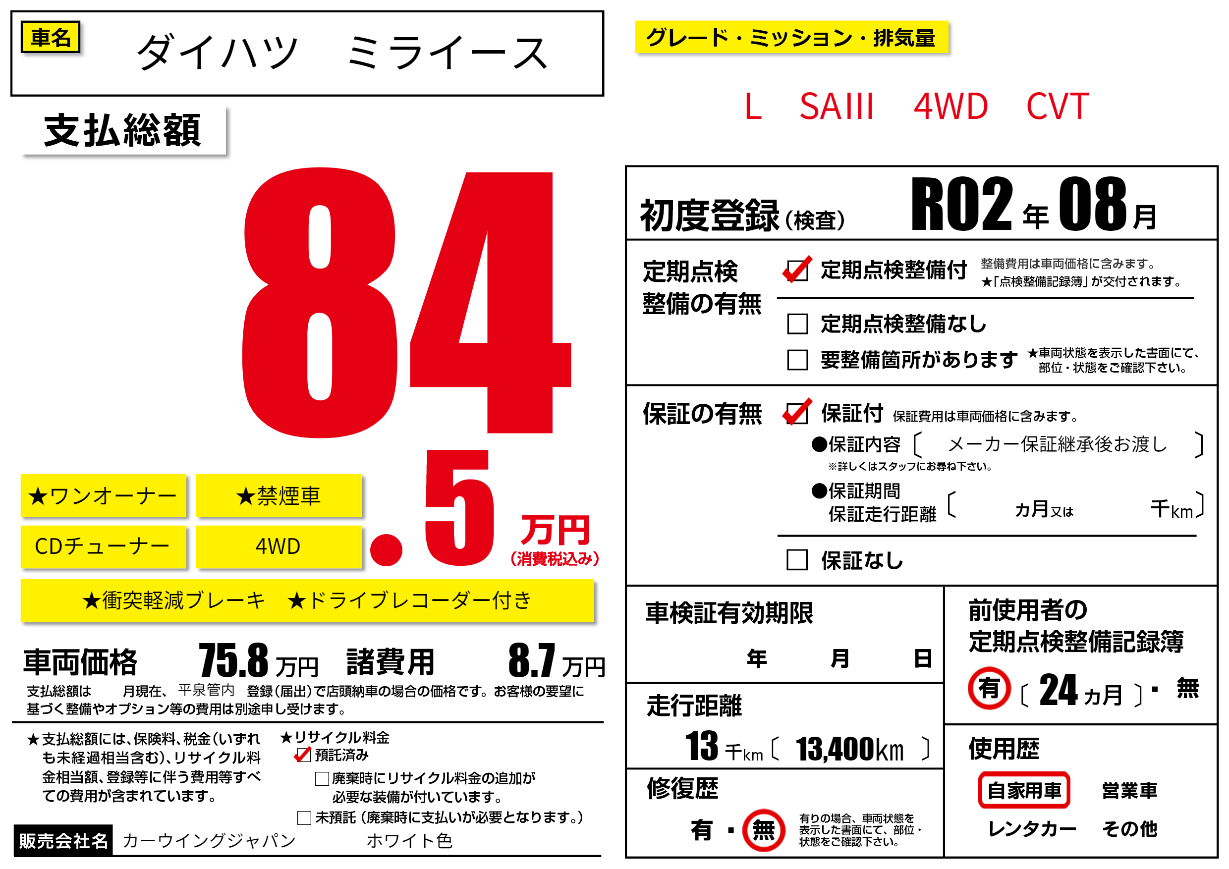 | 走行キロ | 1.3万km | 初年度登録 | R02年08月 |