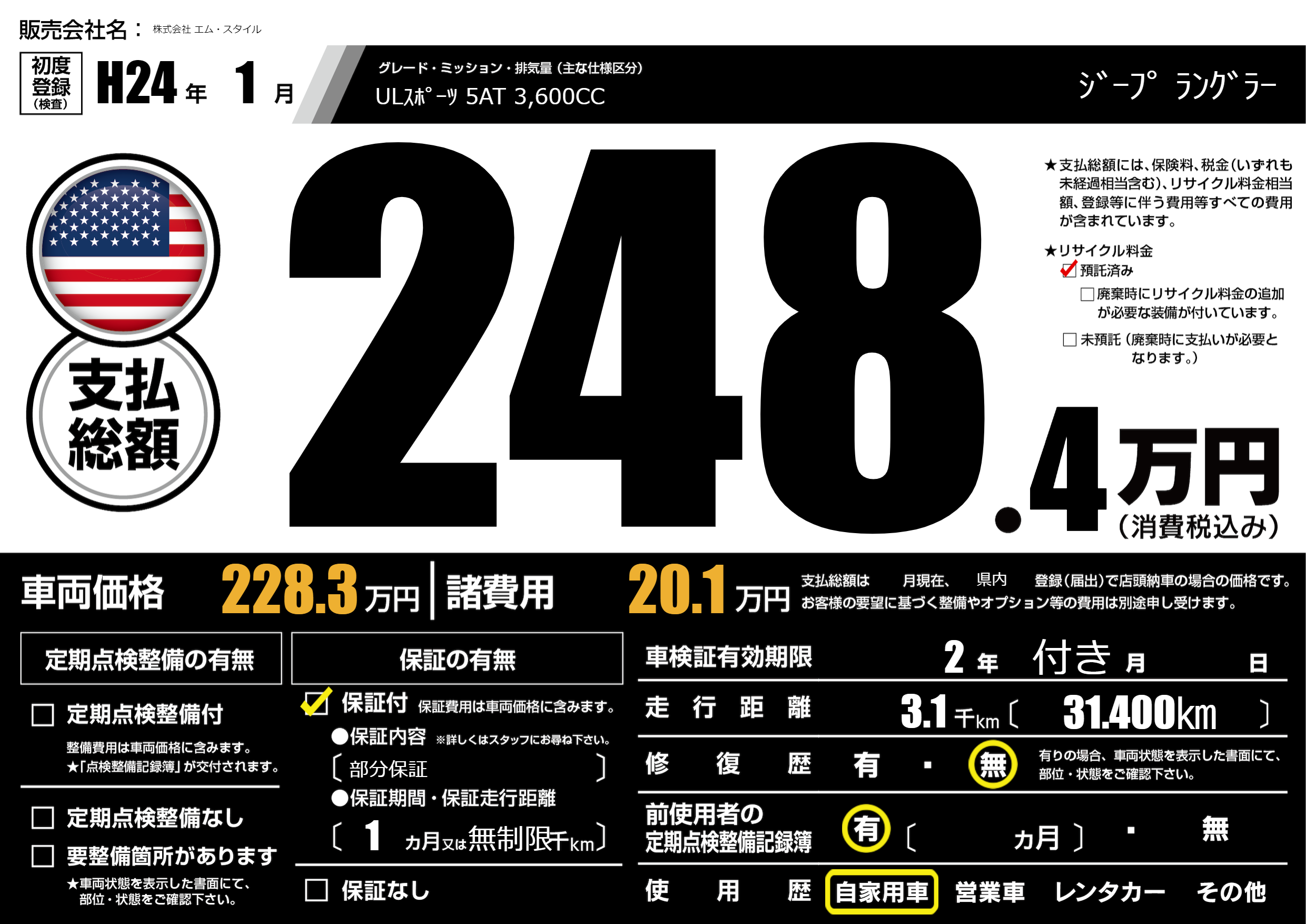 | 車名 | ジープ ラングラー | グレード ミッション 排気量 |