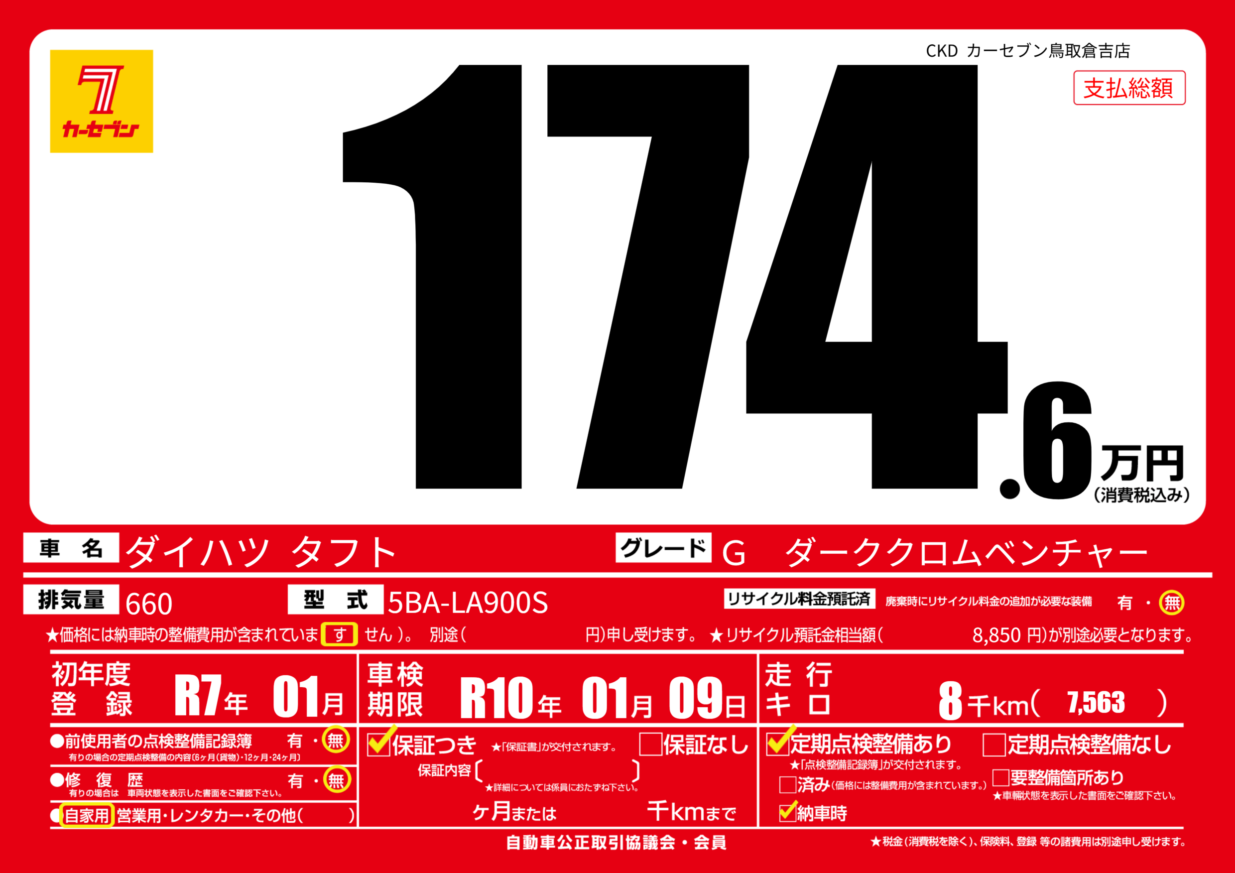 | 走行キロ | 0.8万km | 初年度登録 | R7年01月 |