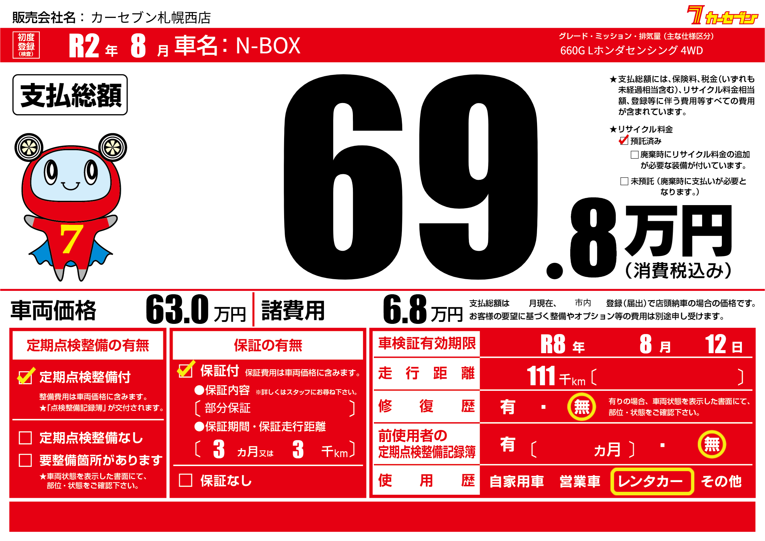 | 走行キロ | 11.1万km | 初年度登録 | R2年8月 |