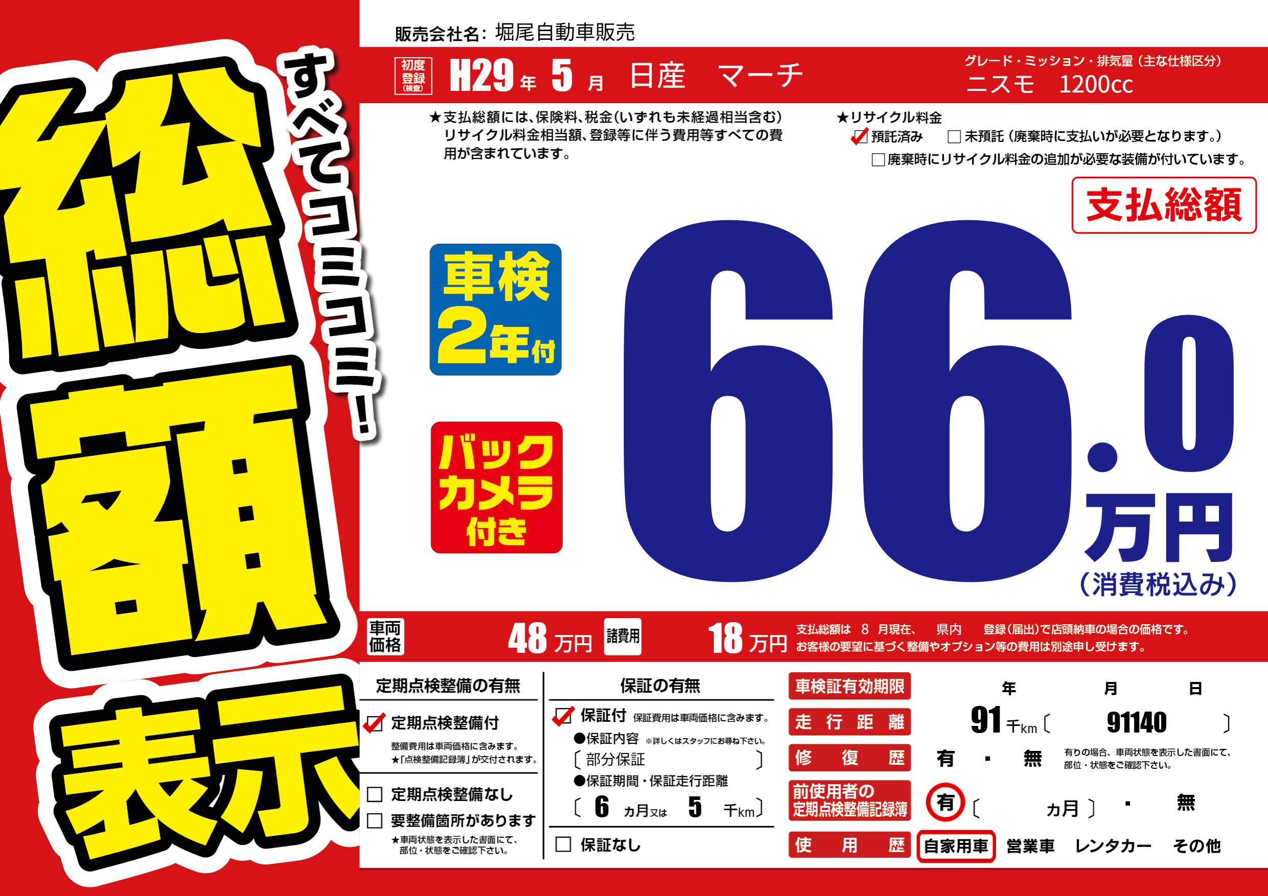 | 走行キロ | 9.1万km | 初年度登録 | H29年5月 |