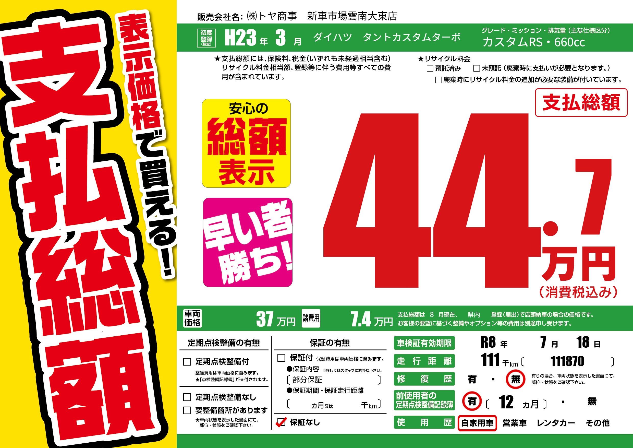 | 走行キロ | 11.1万km | 初年度登録 | H23年3月 |