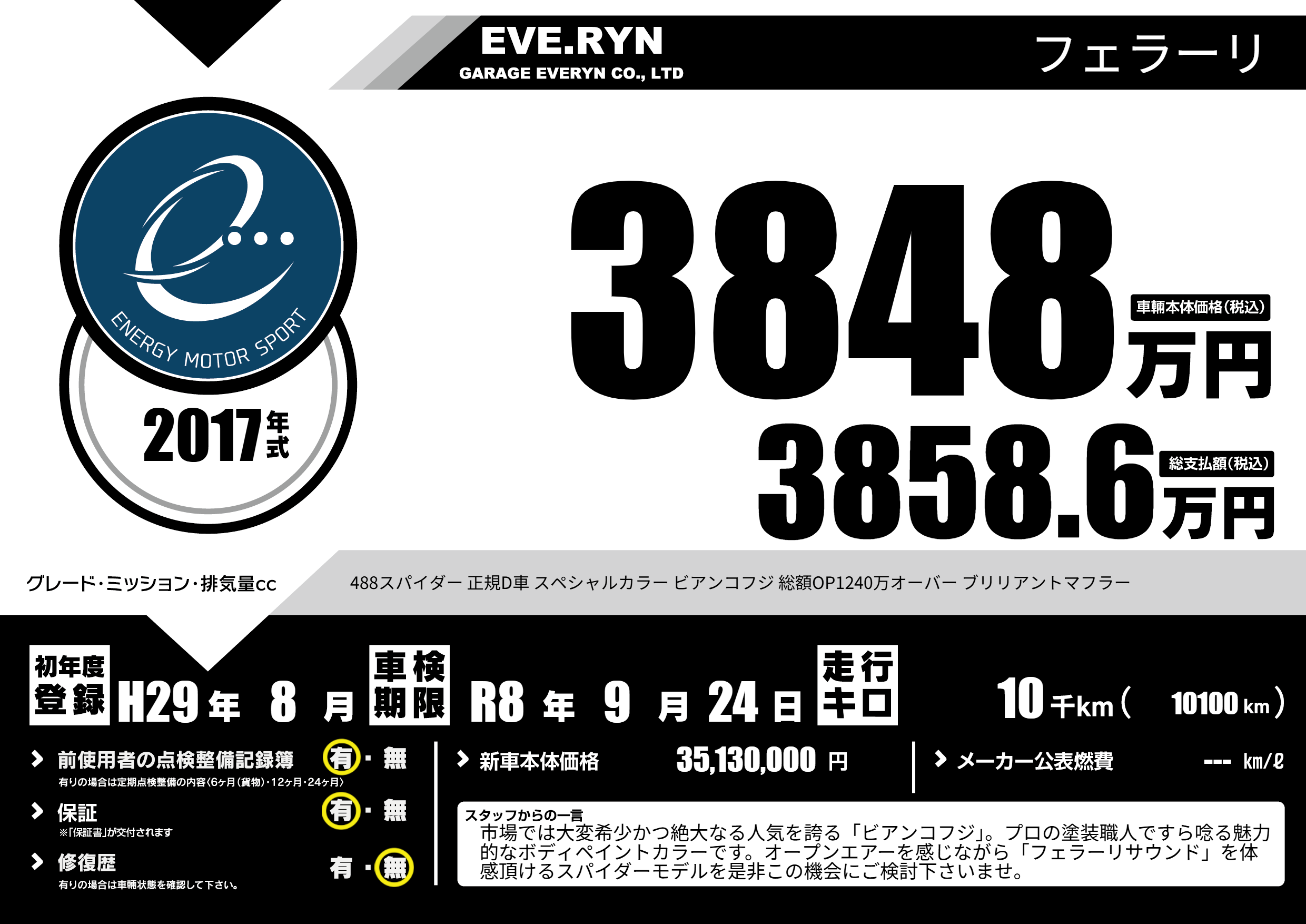 488スパイダー 正規D車 スペシャルカラー ビアンコフジ 総額OP1240万オーバー ブリリアントマフラー |