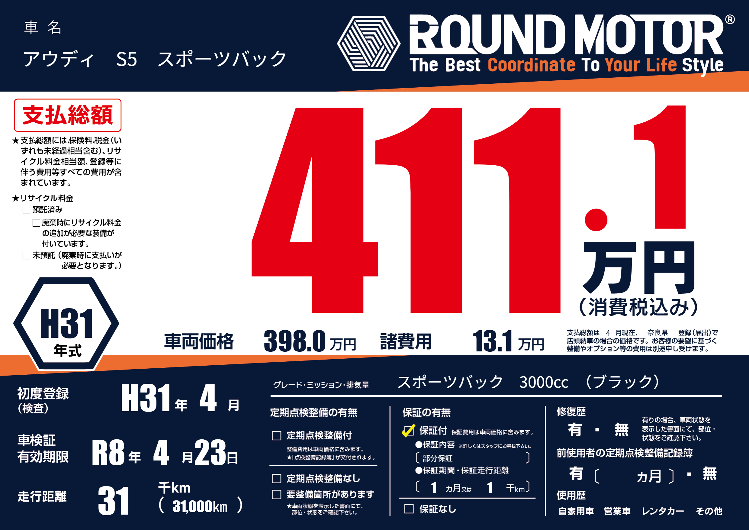 | 走行キロ | 3.1万km | 初年度登録 | H31年4月 |