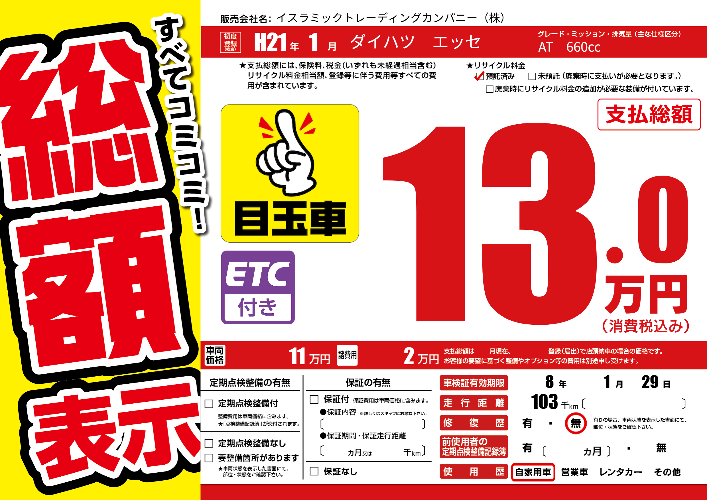 | 車名 | ダイハツ エッセ | グレード ミッション 排気量 |