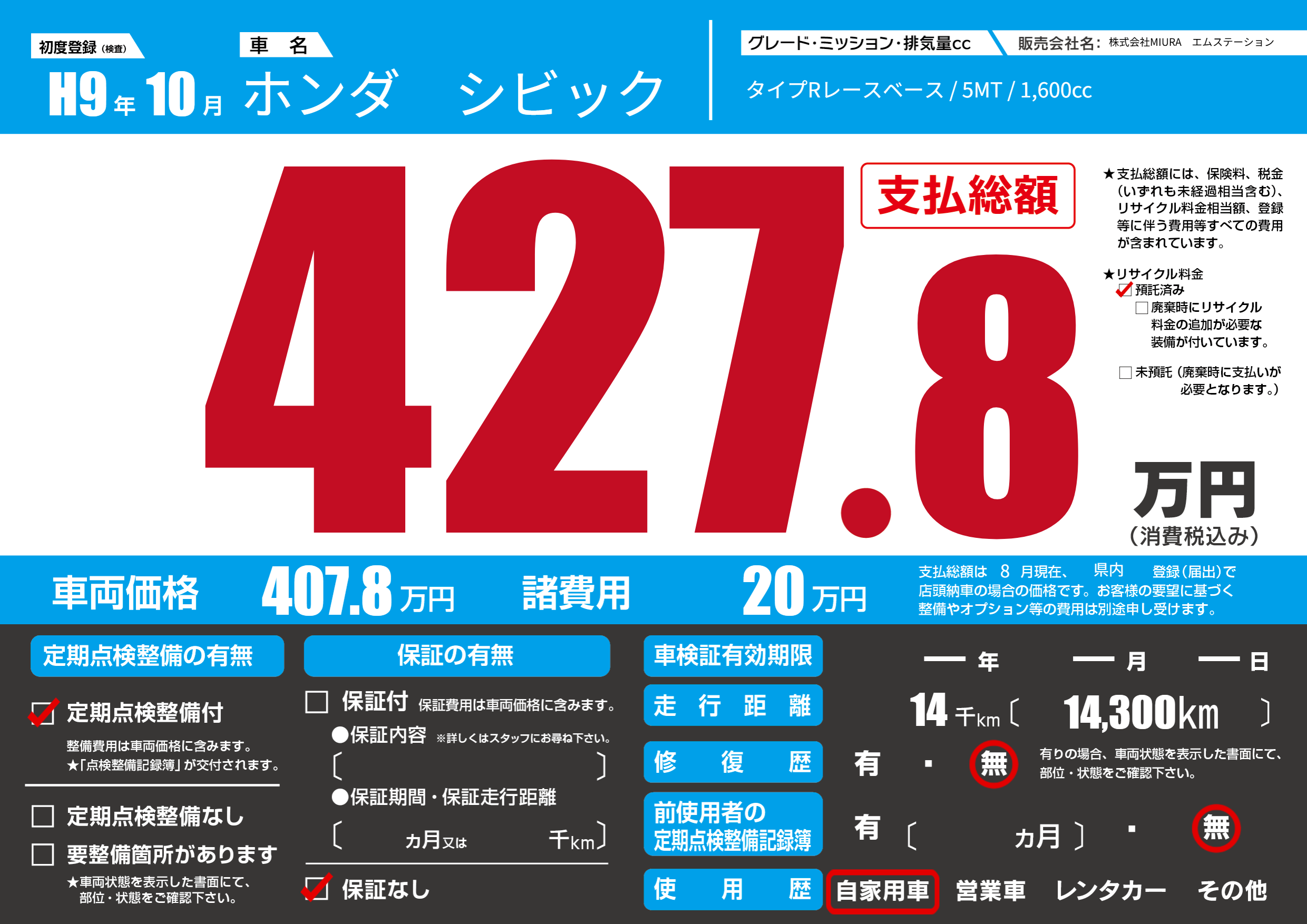 | 走行キロ | 1.4万km | 初年度登録 | H9年10月 |