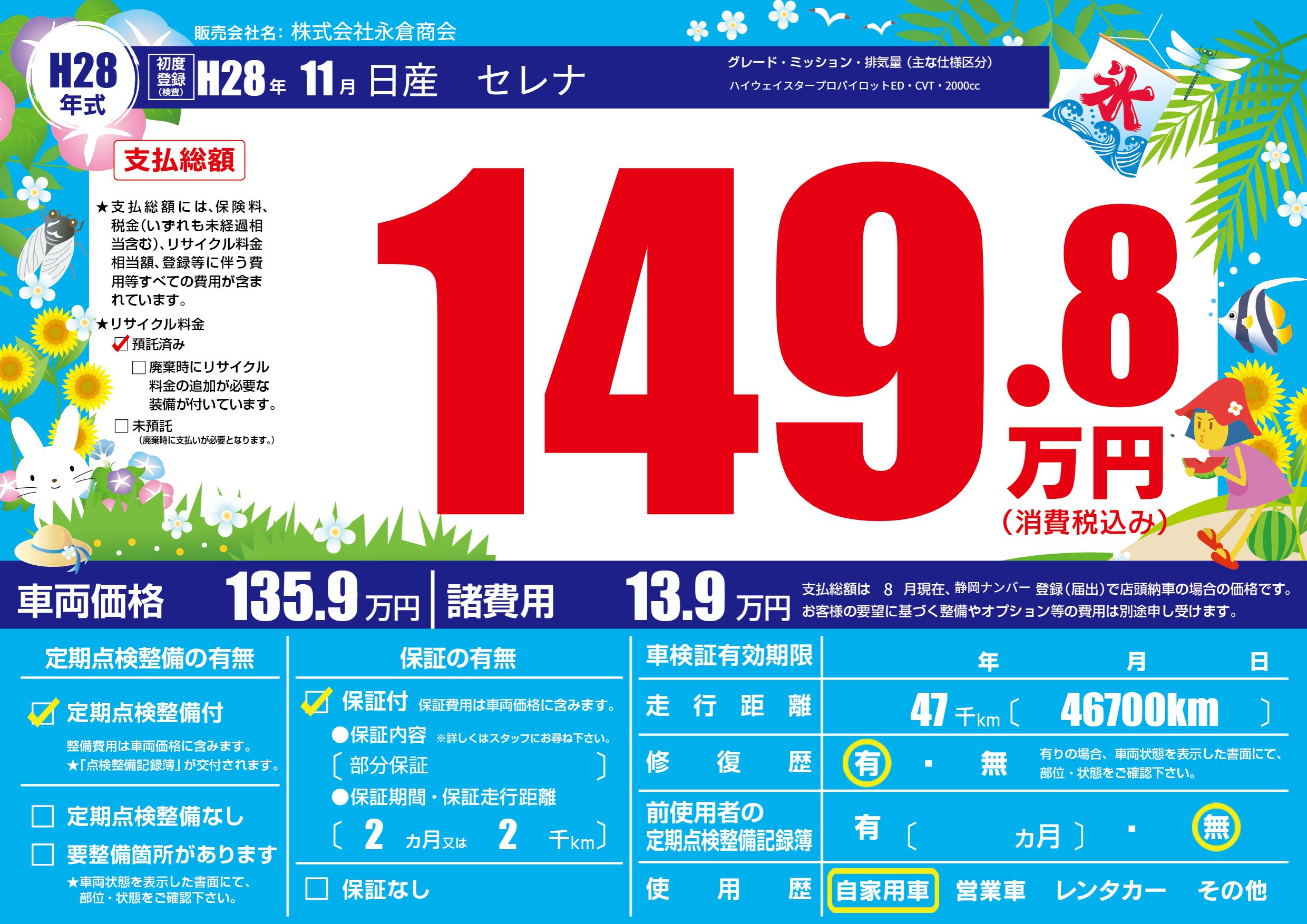 | 車名 | 日産 セレナ | グレード ミッション 排気量 |
