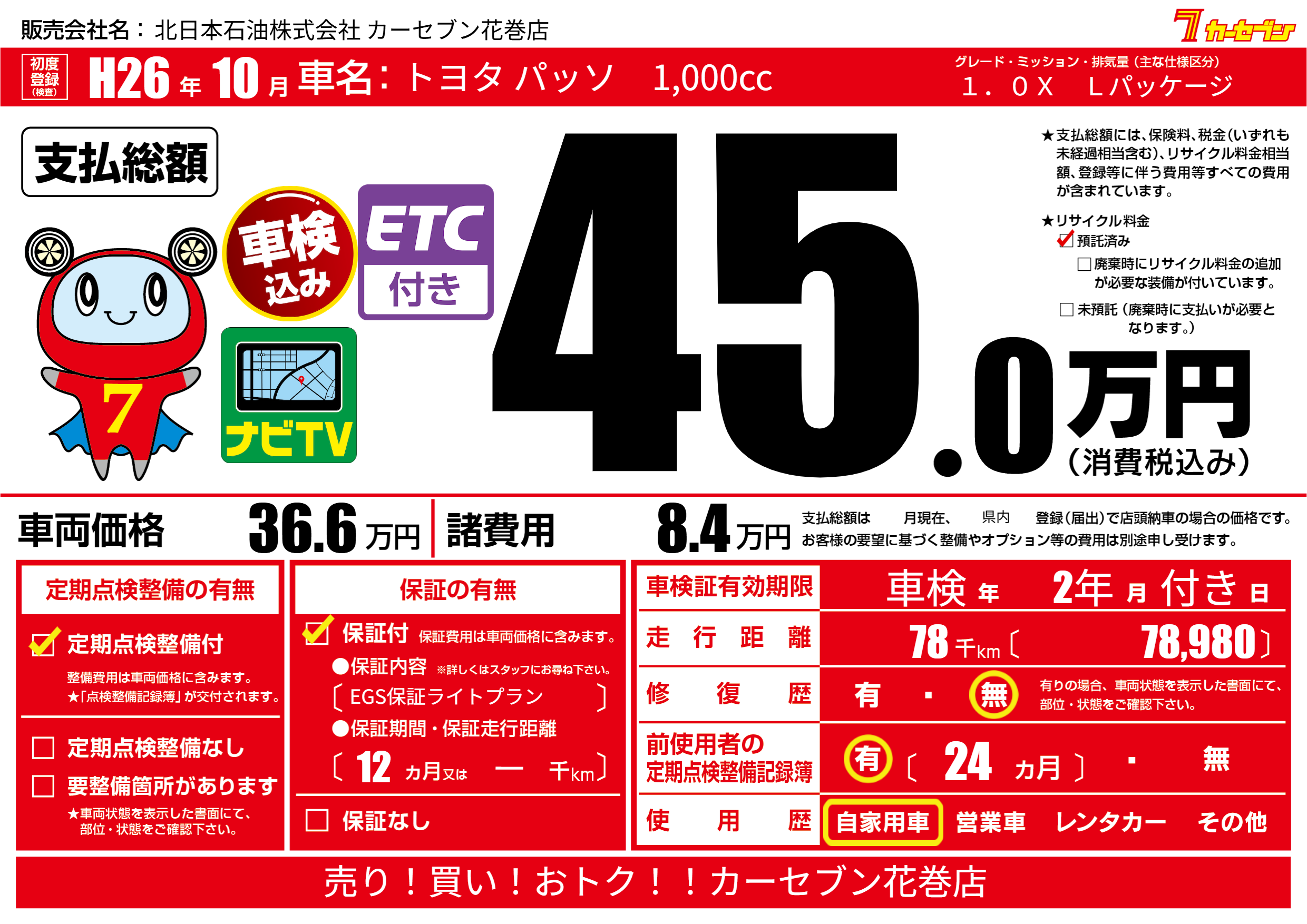 | 車名 | トヨタ パッソ 1,000cc | グレード ミッション 排気量 |