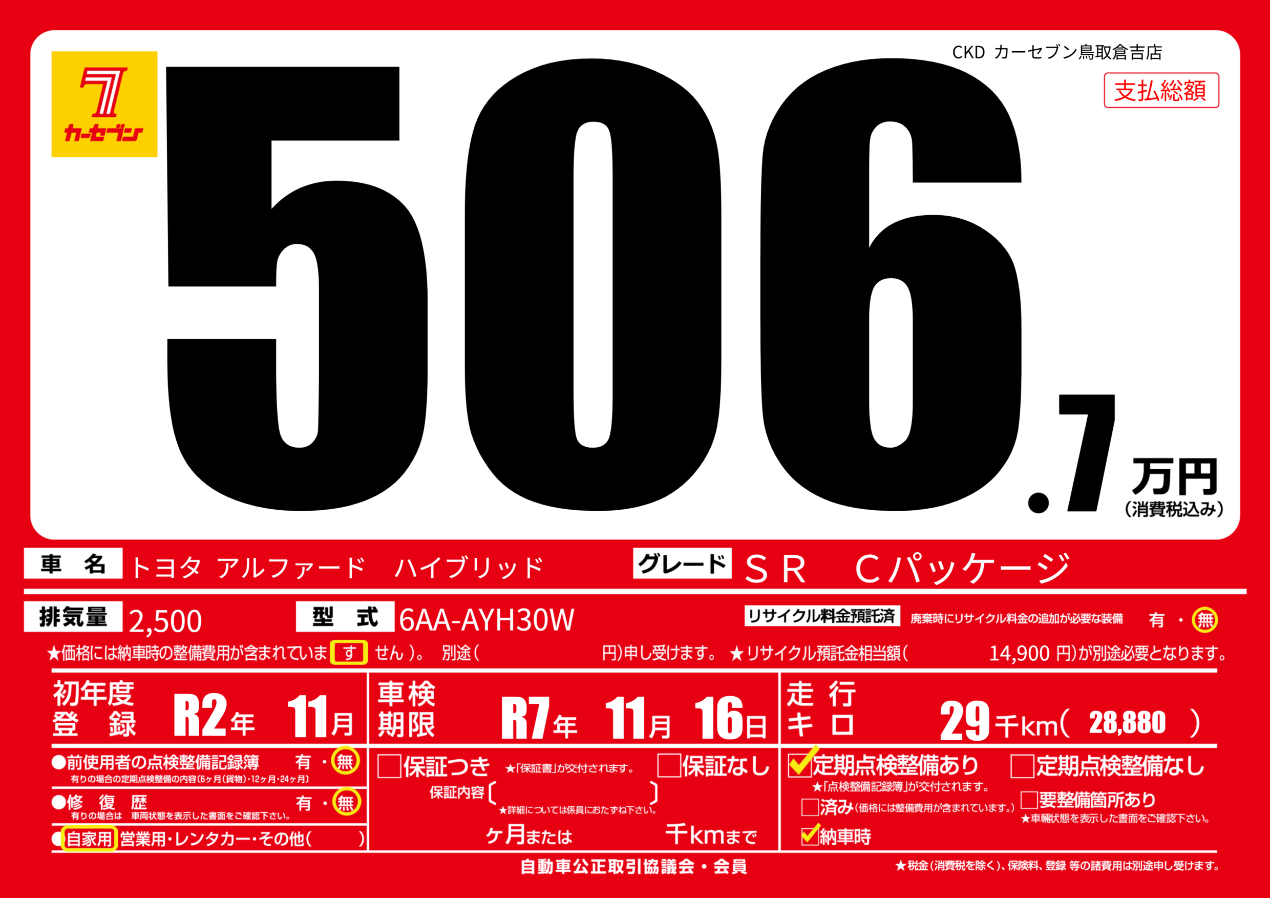 | 車名 | トヨタ アルファード ハイブリッド | グレード ミッション 排気量 |