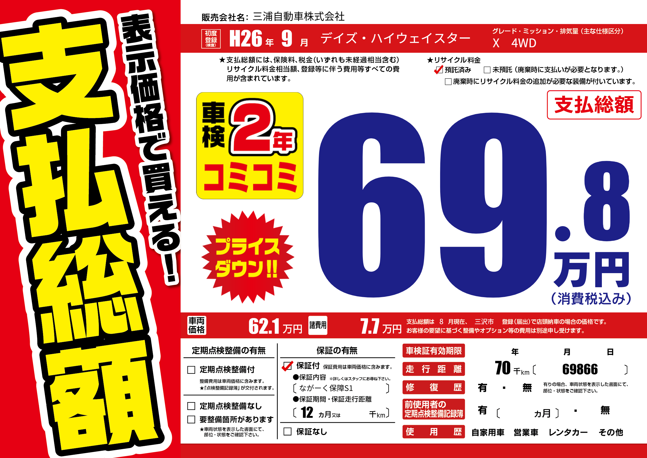 | 走行キロ | 7万km | 初年度登録 | H26年9月 |