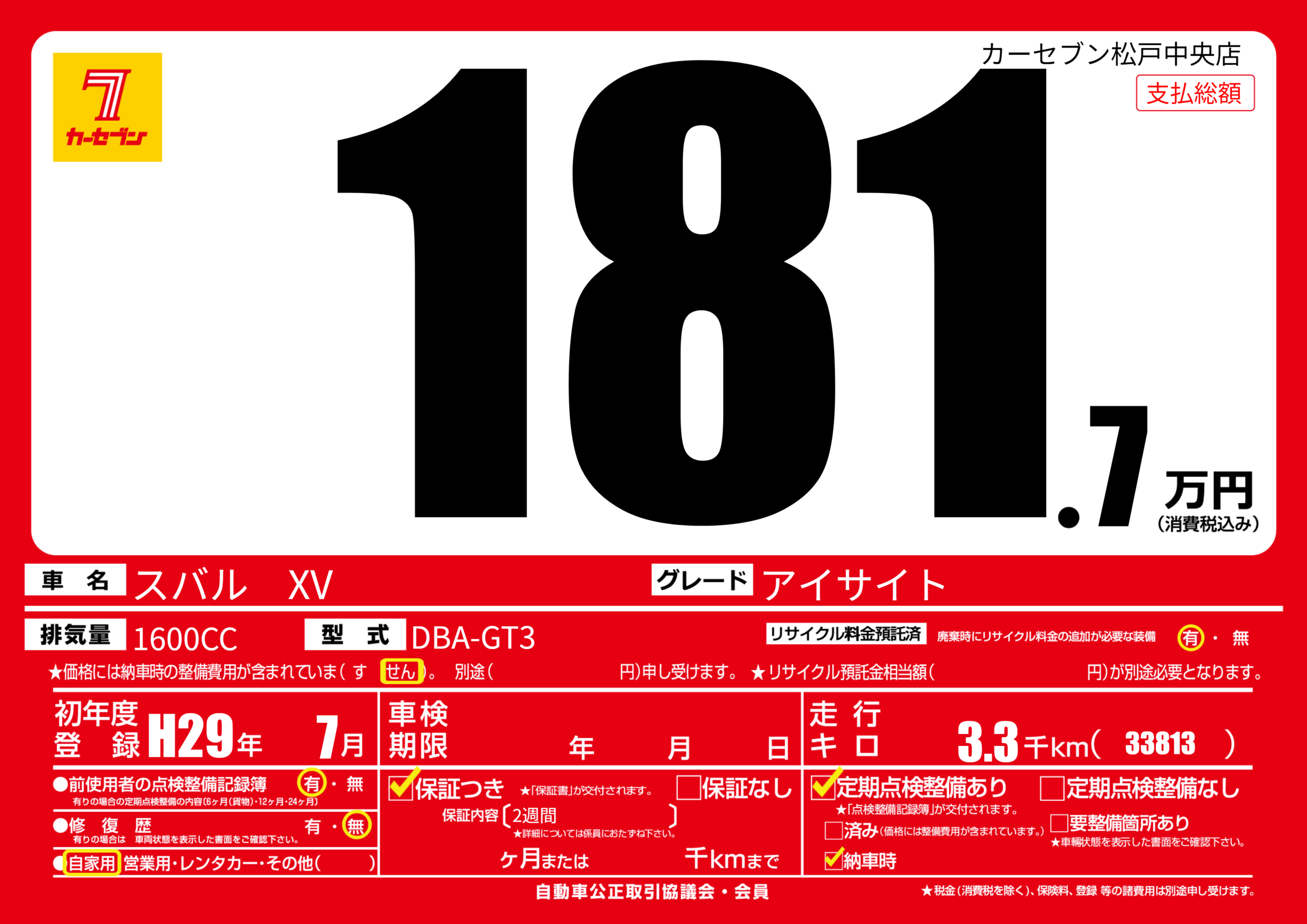 | 車名 | スバル XV | グレード ミッション 排気量 |