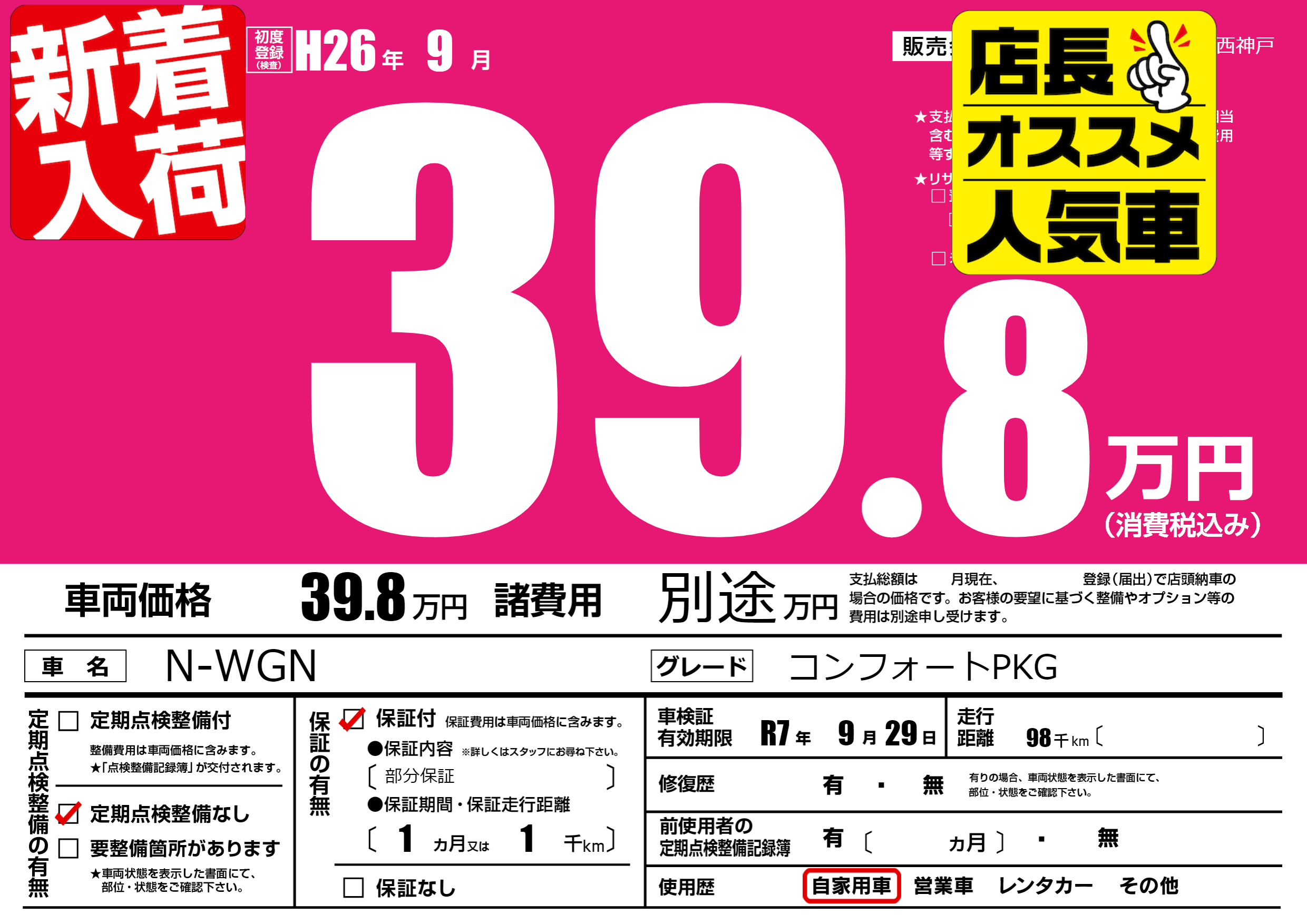 | 走行キロ | 9.8万km | 初年度登録 | H26年9月 |