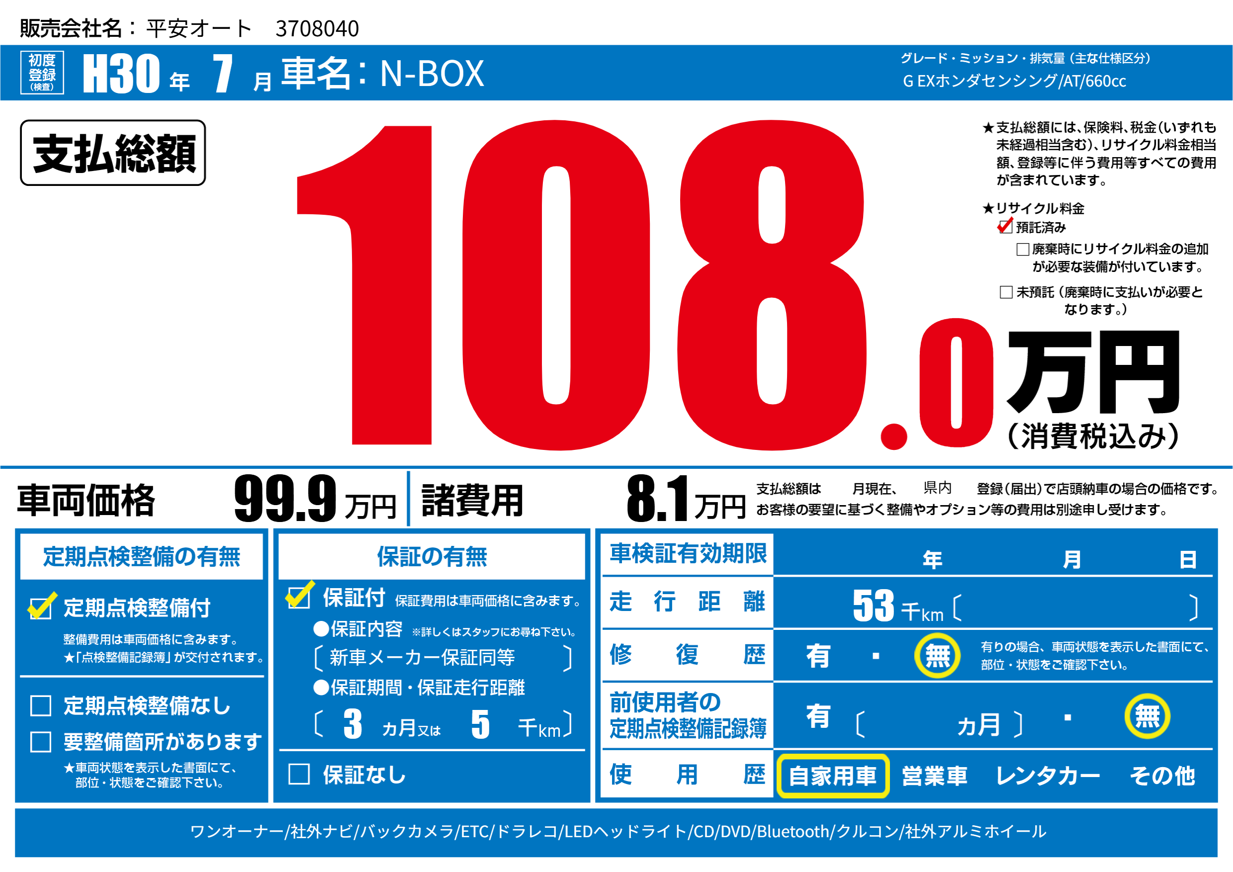 | 車名 | N-BOX | グレード ミッション 排気量 |