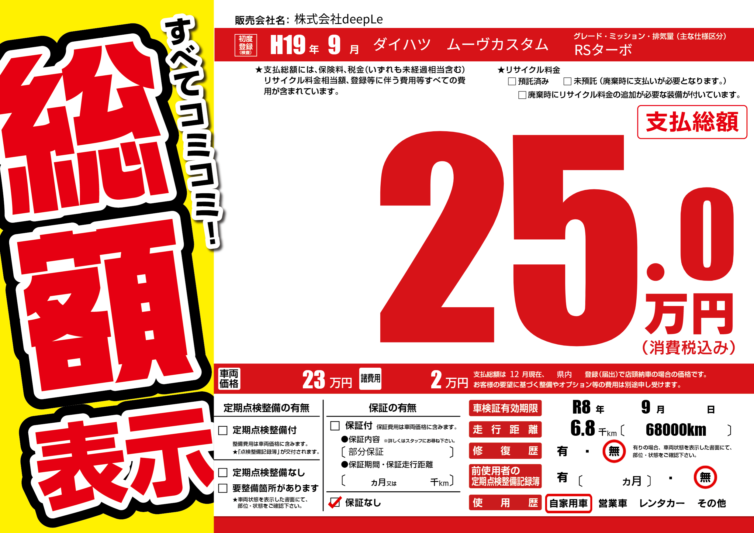 保証なし 保証内容(部分保証) ---ヶ月または()千kmまで |