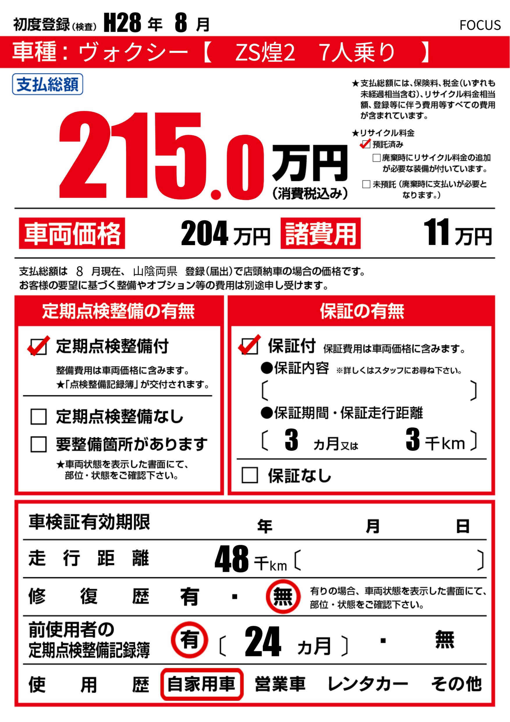 | 走行キロ | 4.8万km | 初年度登録 | H28年8月 |