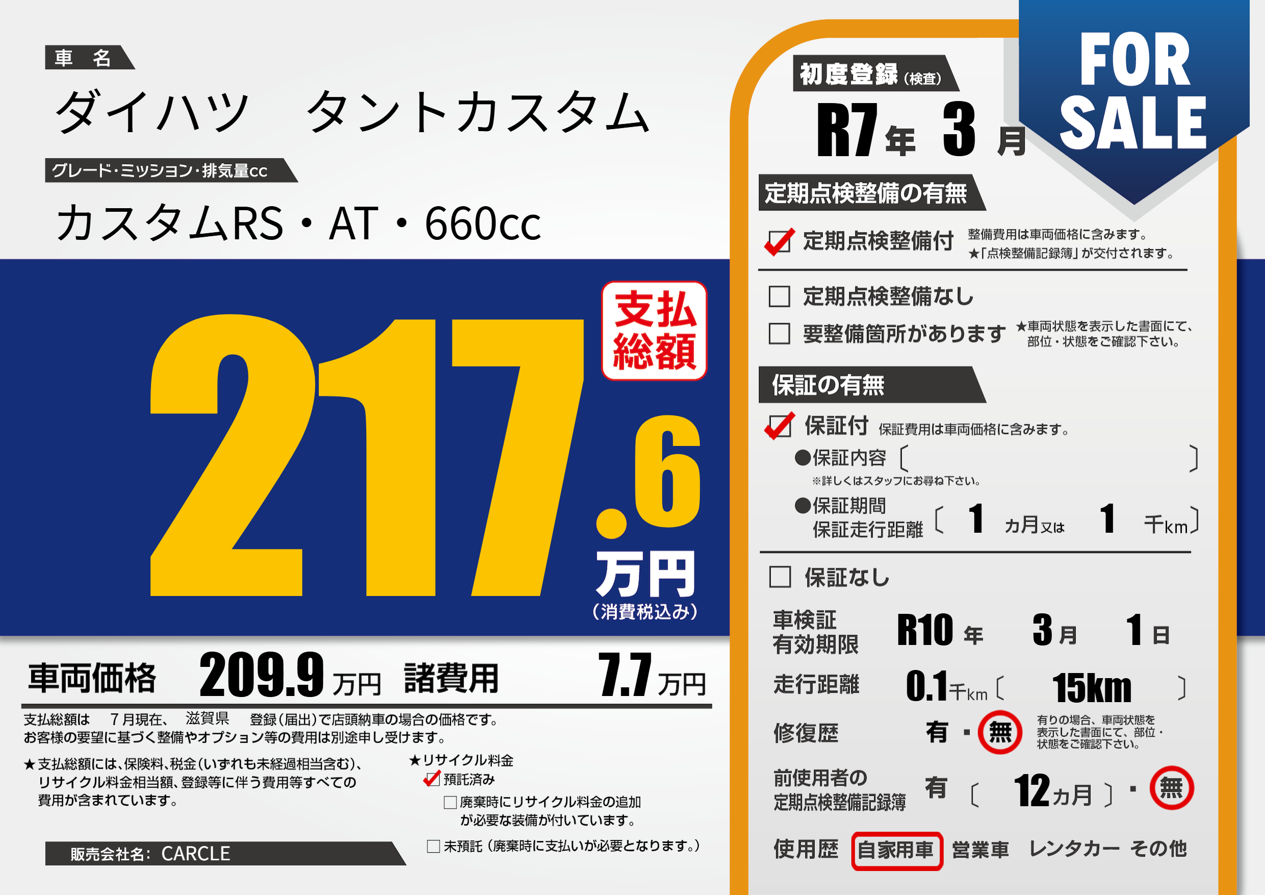 | 車名 | ダイハツ タントカスタム | グレード ミッション 排気量 |