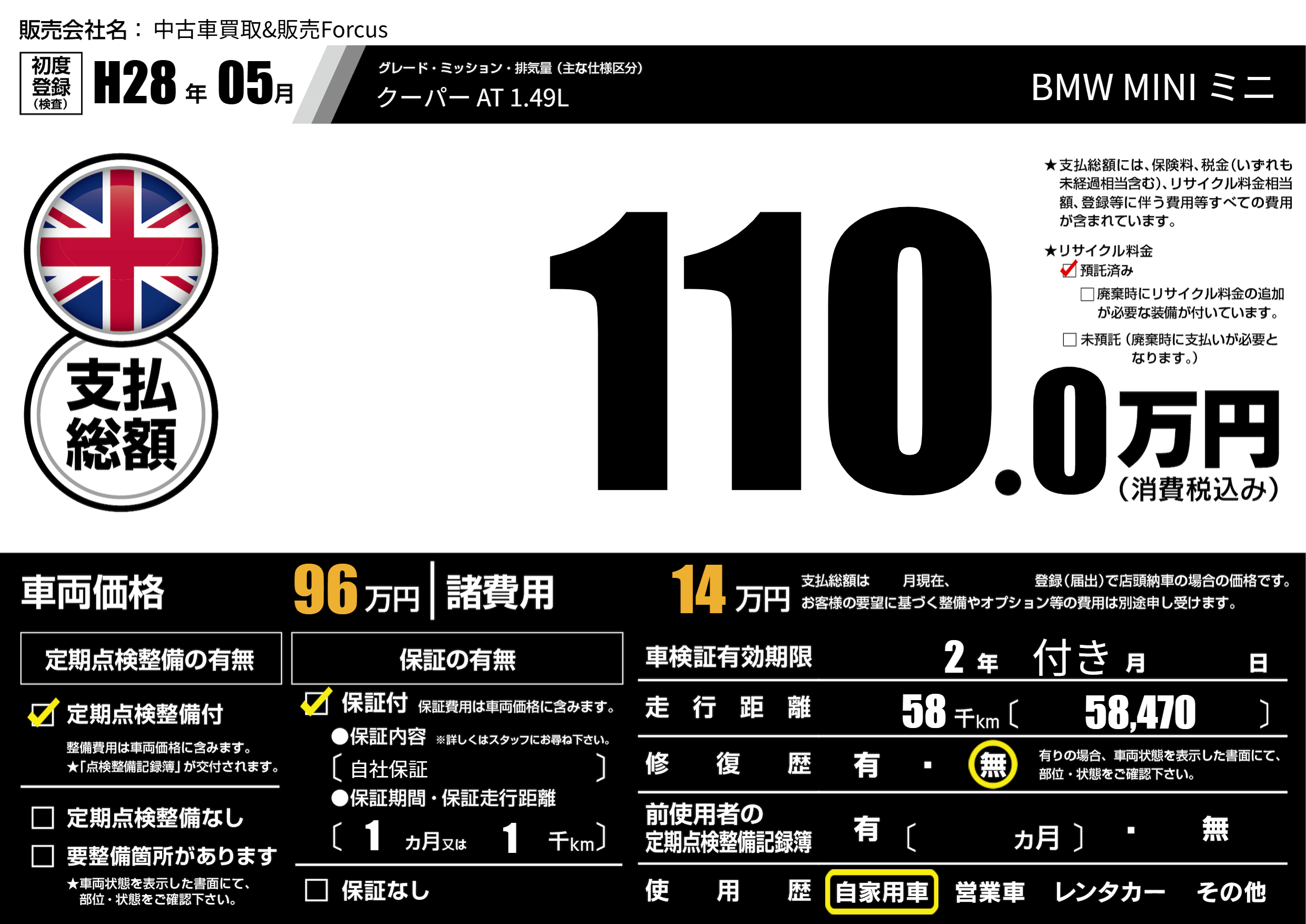 保証付き 保証内容(自社保証) 1ヶ月または(1)千kmまで |