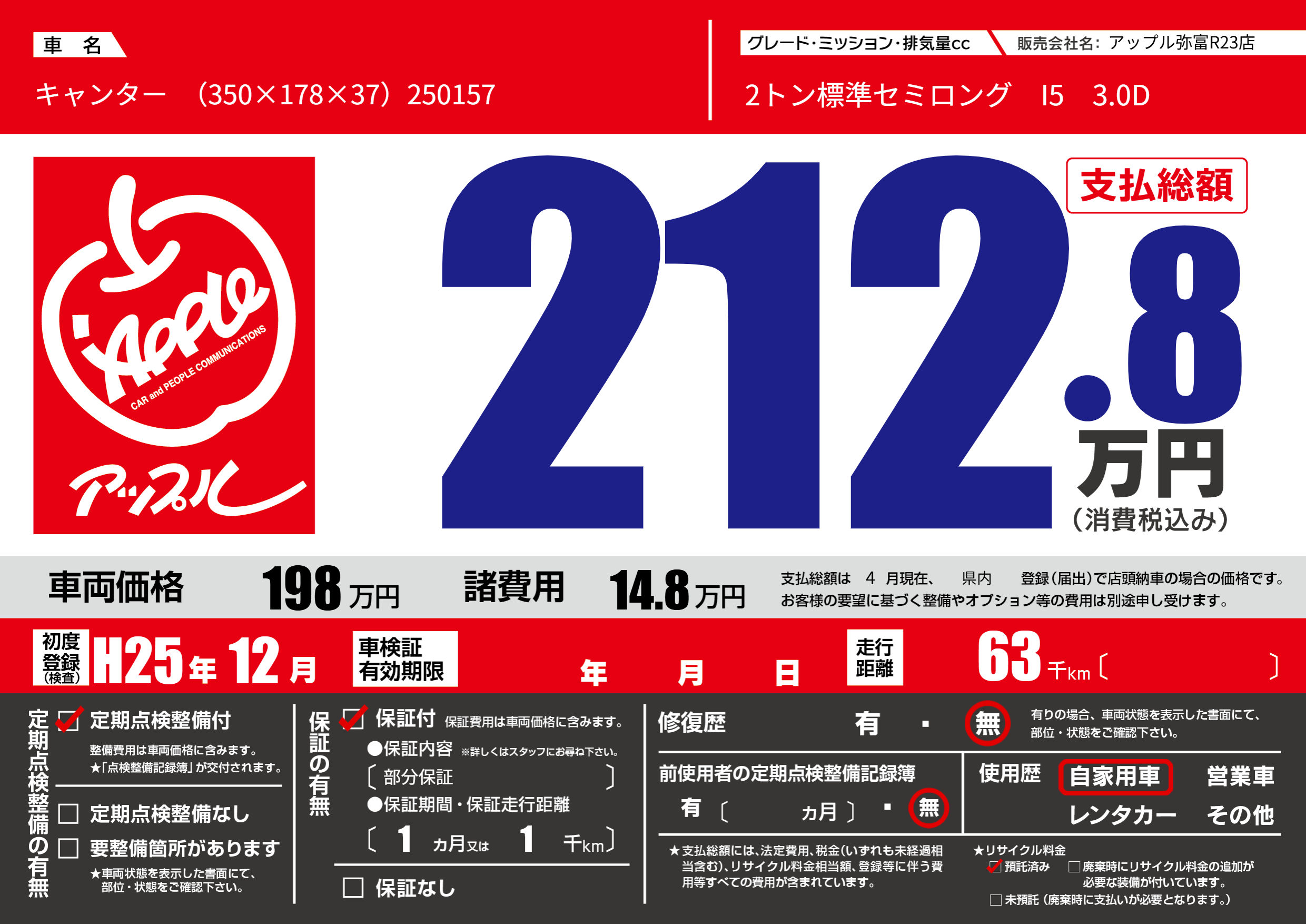 | 車名 | キャンター (350×178×37)250157 | グレード ミッション 排気量 |