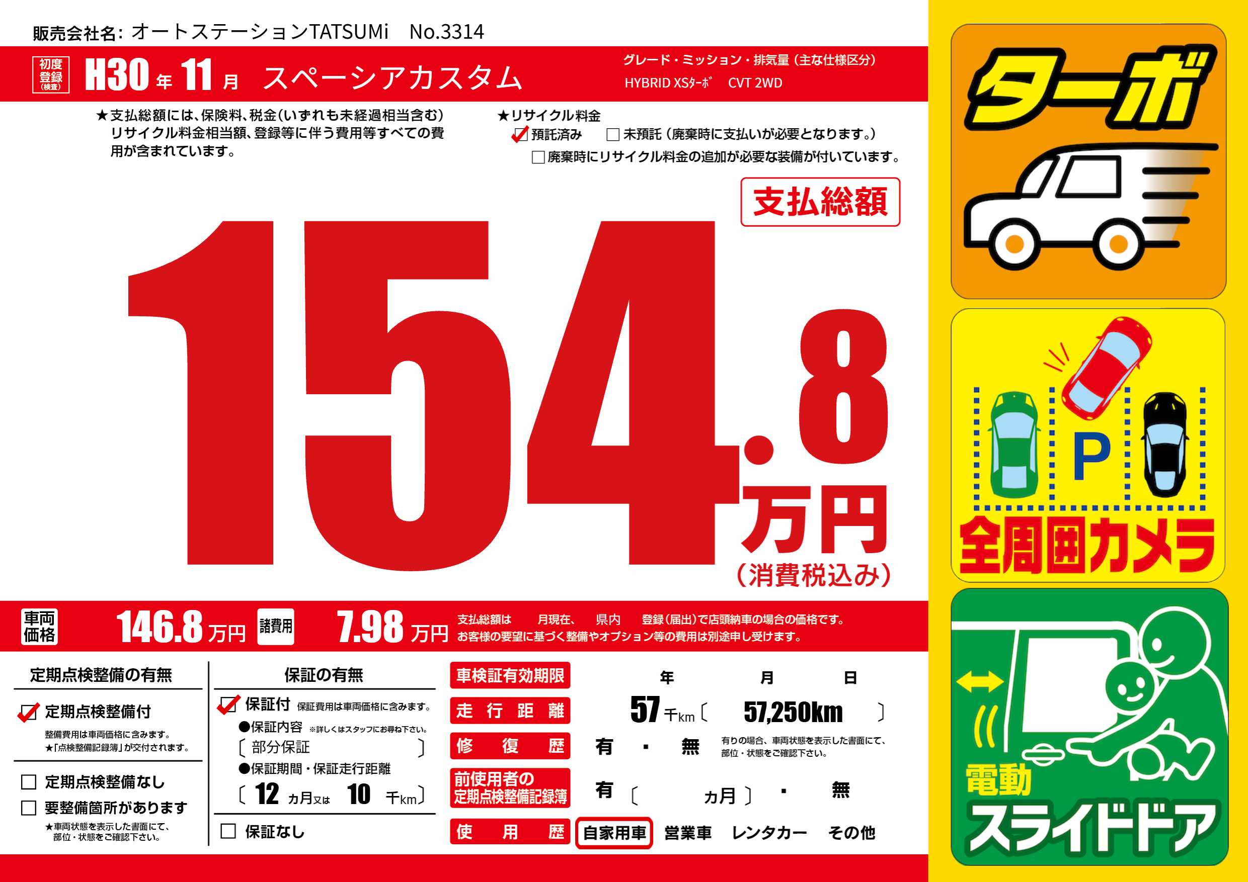 | 車名 | スペーシアカスタム | グレード ミッション 排気量 |