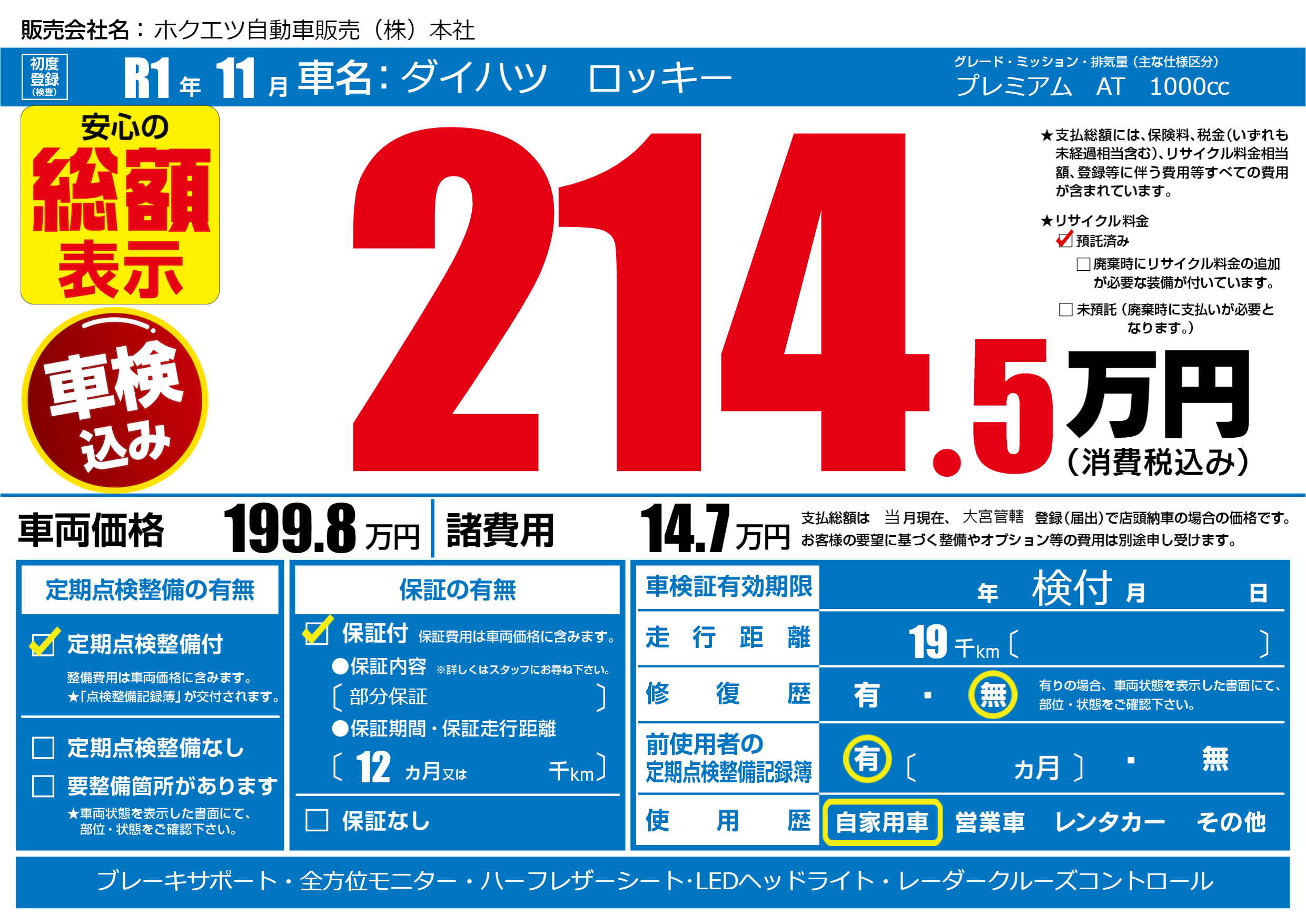 | 車名 | ダイハツ ロッキー | グレード ミッション 排気量 |