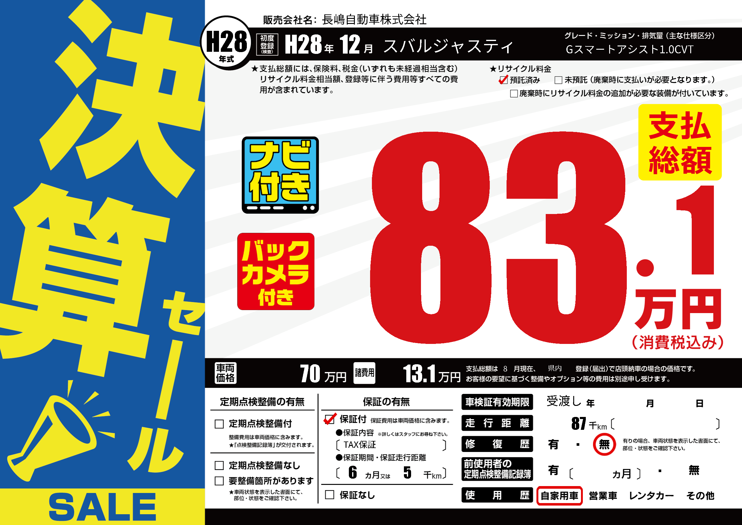 保証付き 保証内容(TAX保証) 6ヶ月または(5)千kmまで |