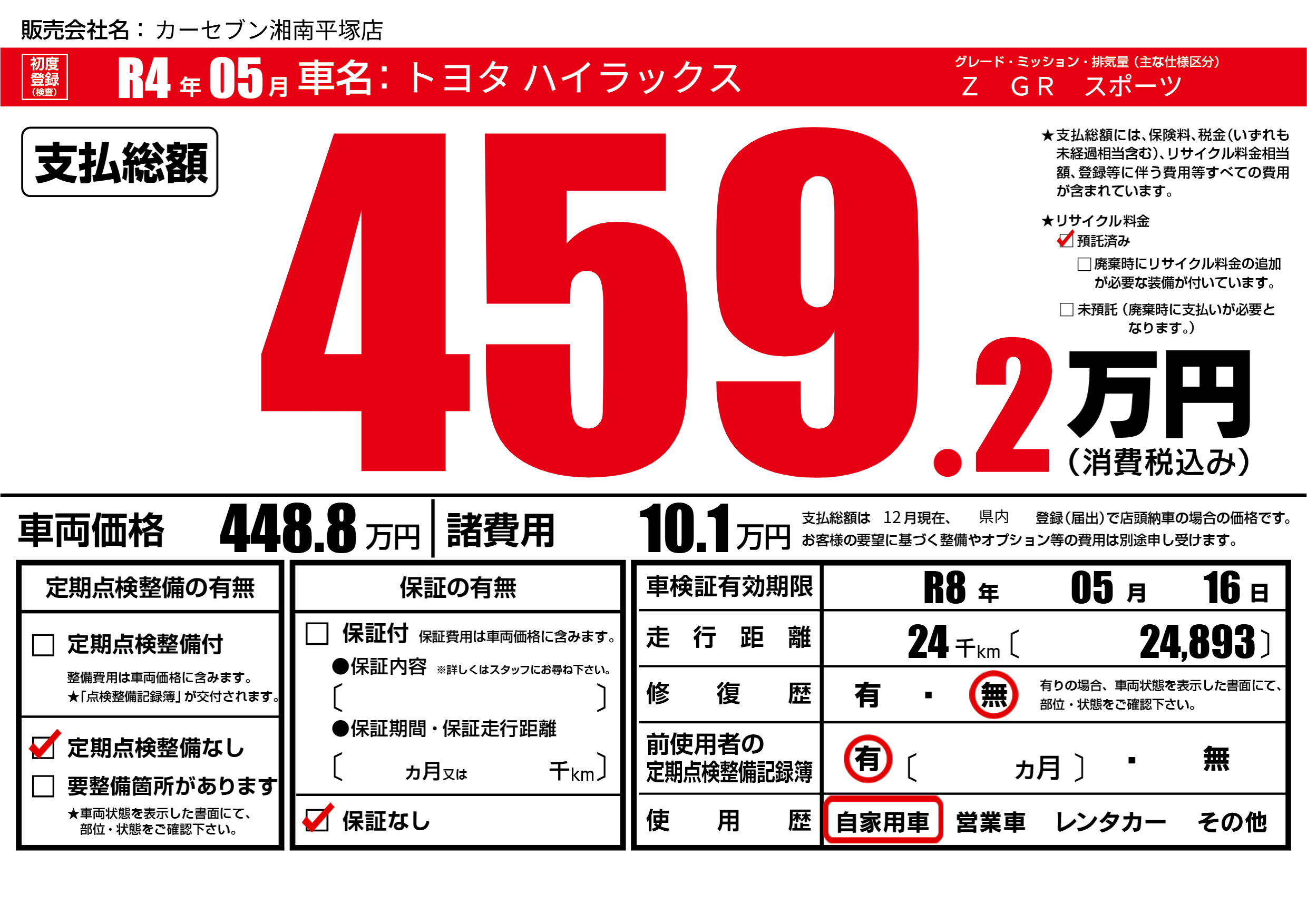| 走行キロ | 2.4万km | 初年度登録 | R4年05月 |
