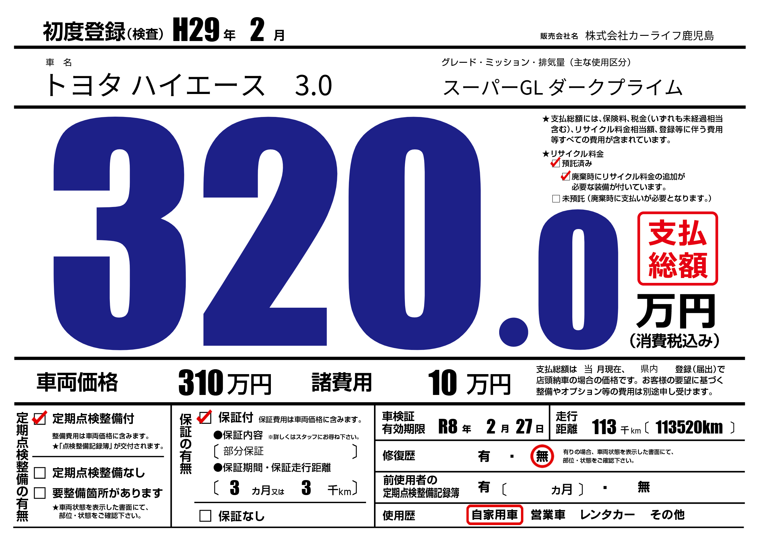 | 車名 | トヨタ ハイエース 3.0 | グレード ミッション 排気量 |