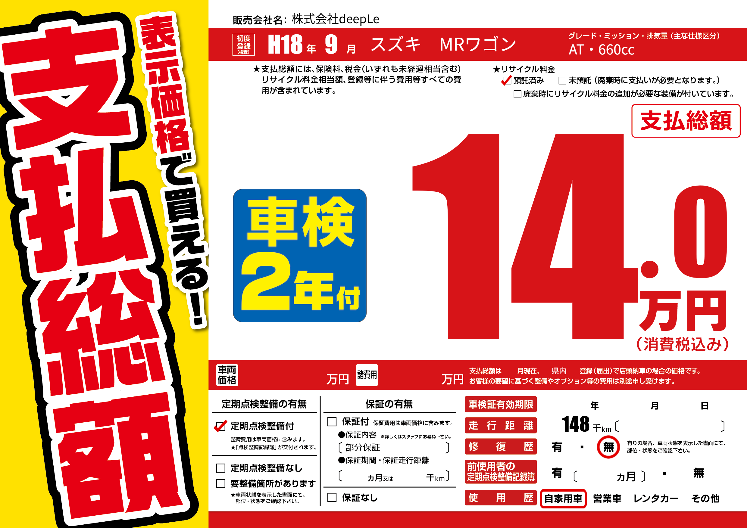 | 走行キロ | 14.8万km | 初年度登録 | H18年9月 |