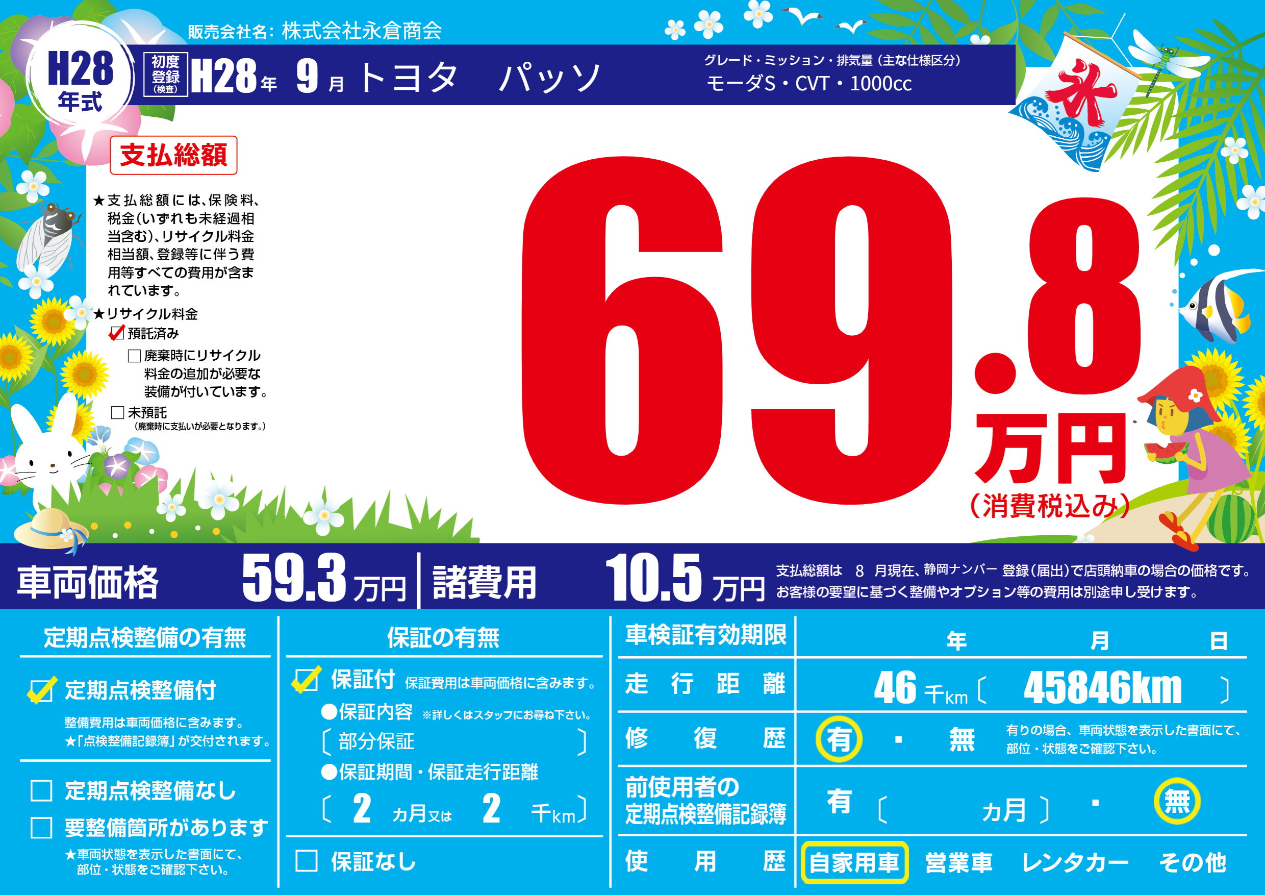 | 車名 | トヨタ パッソ | グレード ミッション 排気量 |