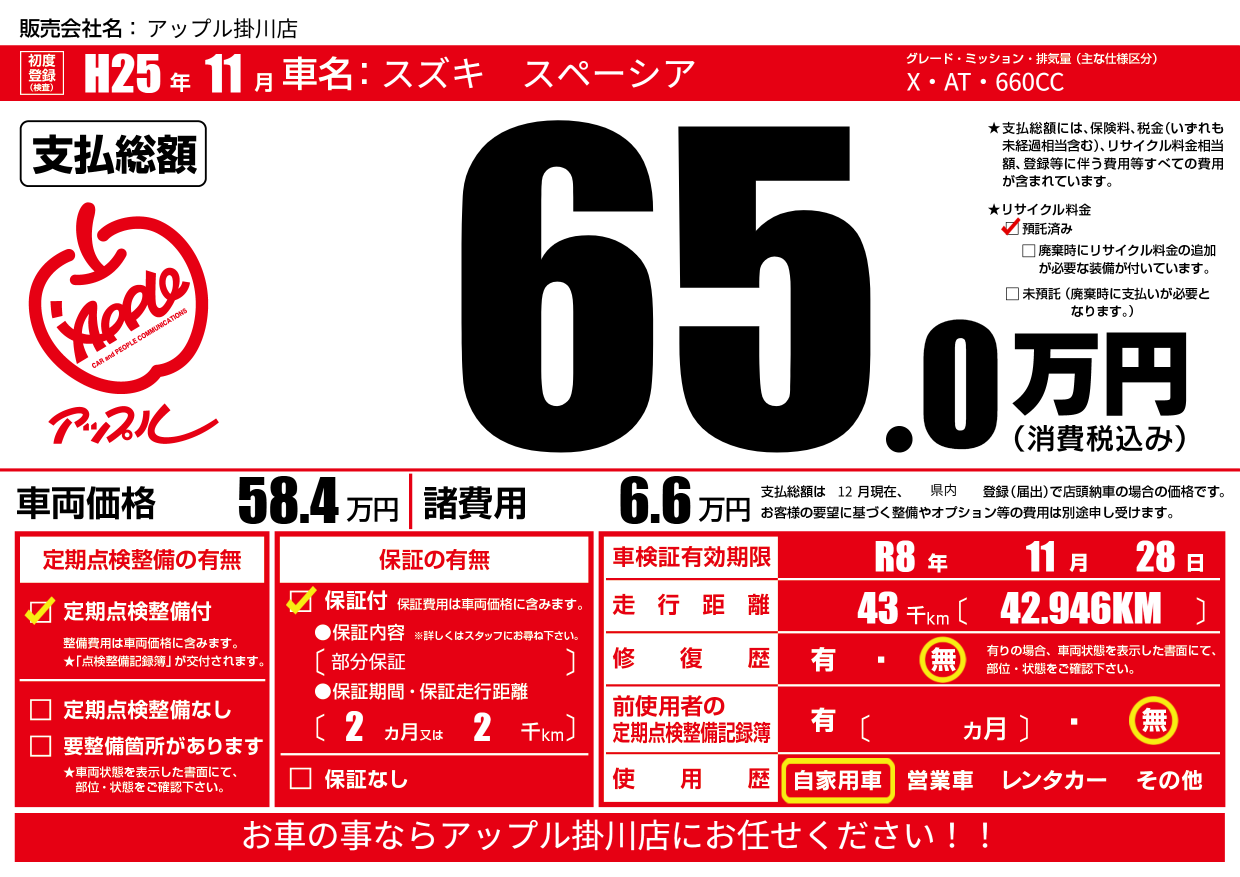 | 走行キロ | 4.3万km | 初年度登録 | H25年11月 |