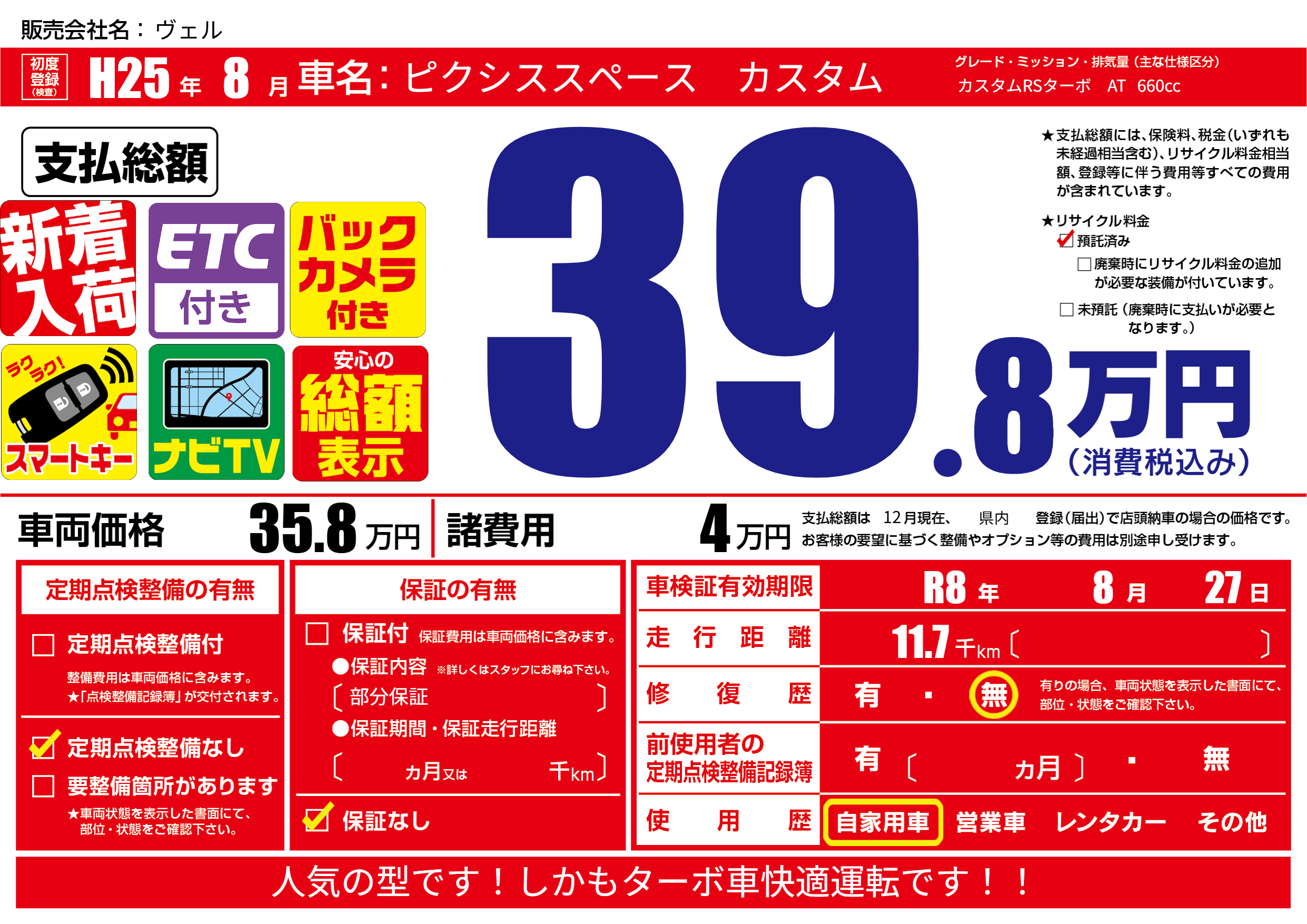 | 走行キロ | 1.1万km | 初年度登録 | H25年8月 |