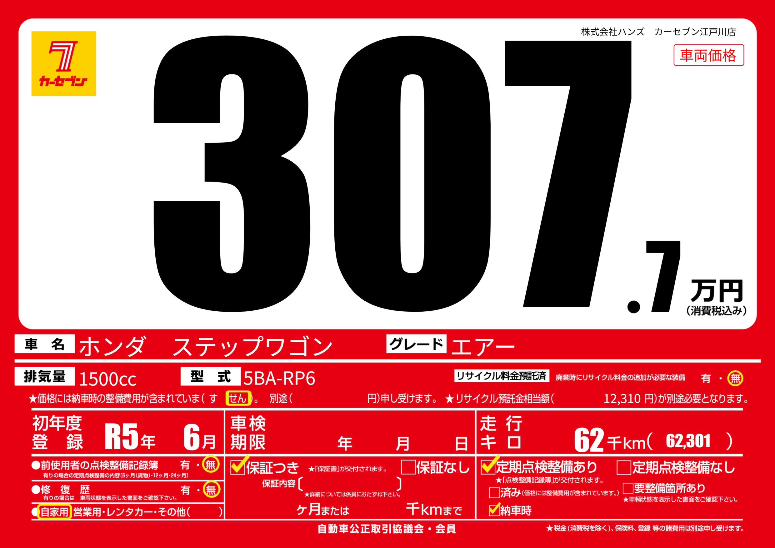 | 車名 | ホンダ ステップワゴン | グレード ミッション 排気量 |