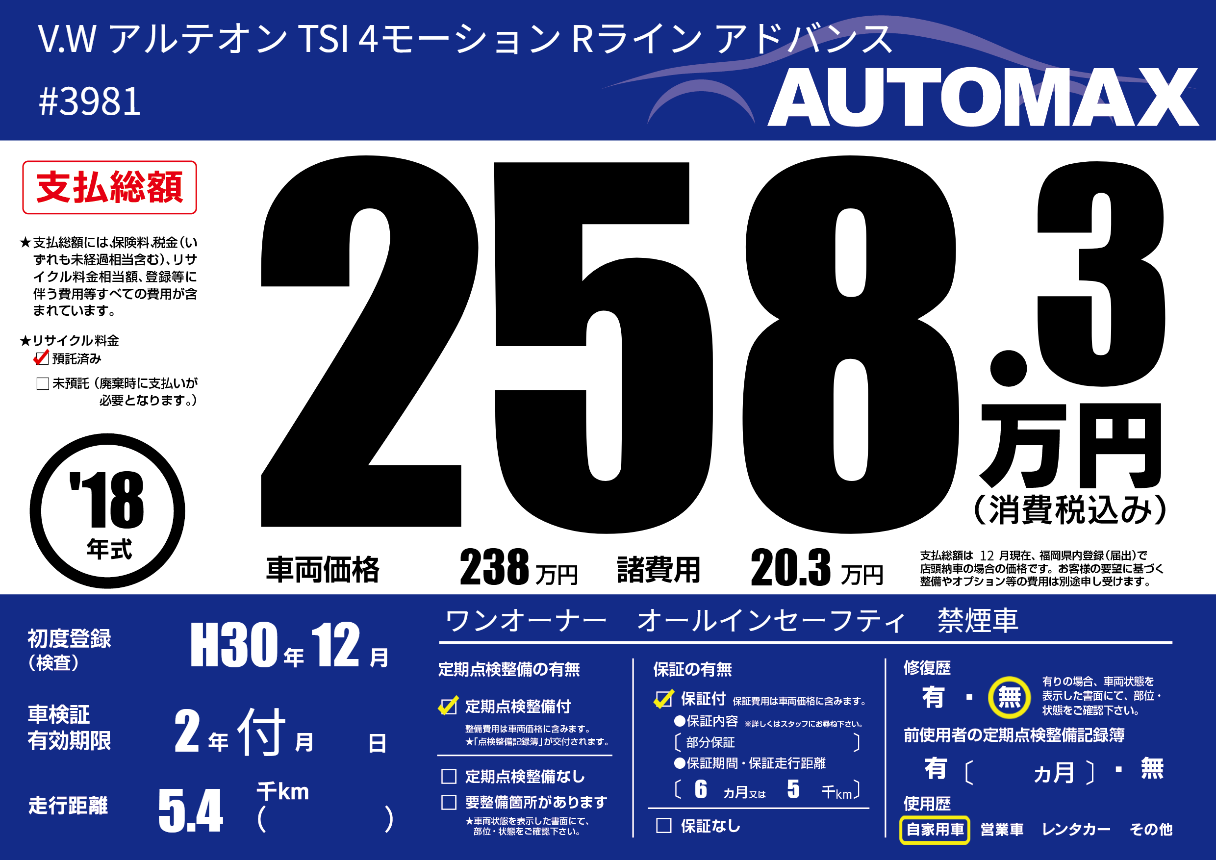 | 走行キロ | 0.5万km | 初年度登録 | H30年12月 |
