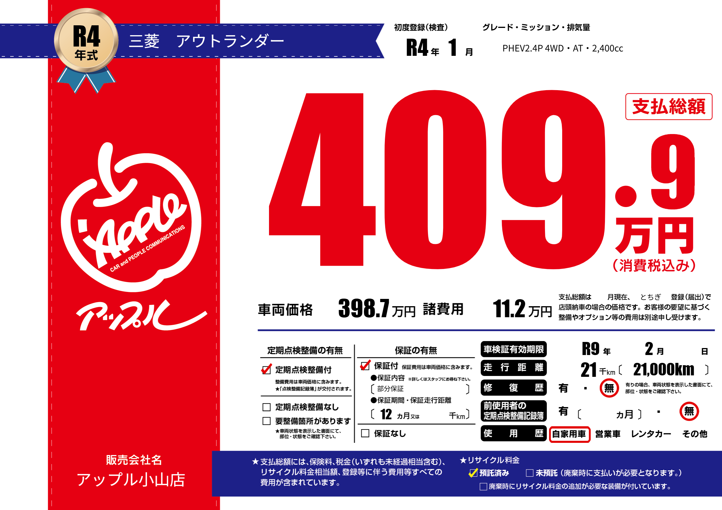 | 車名 | 三菱 アウトランダー | グレード ミッション 排気量 |