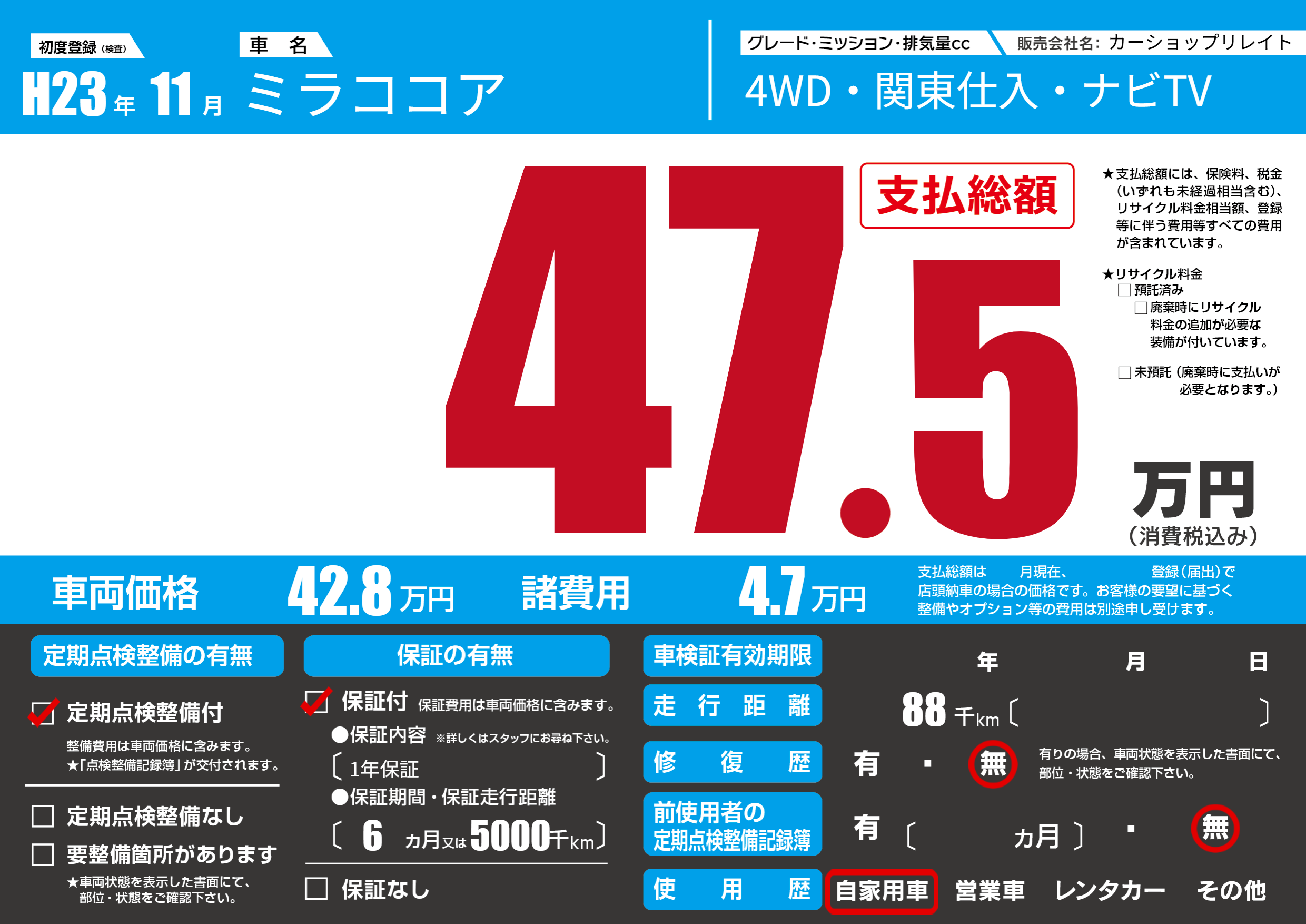 | 走行キロ | 8.8万km | 初年度登録 | H23年11月 |