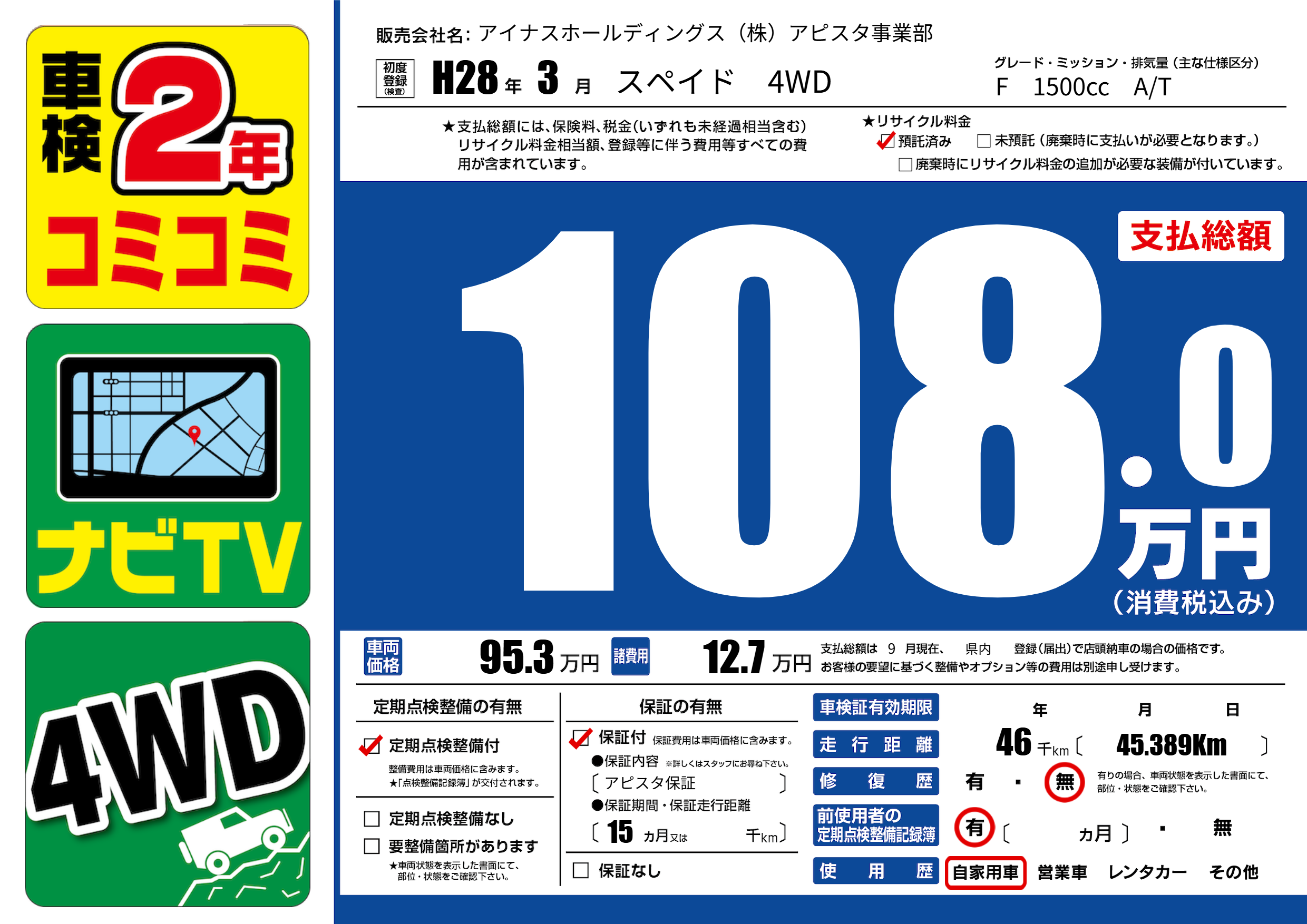 保証付き 保証内容(アピスタ保証) 15ヶ月または()千kmまで |